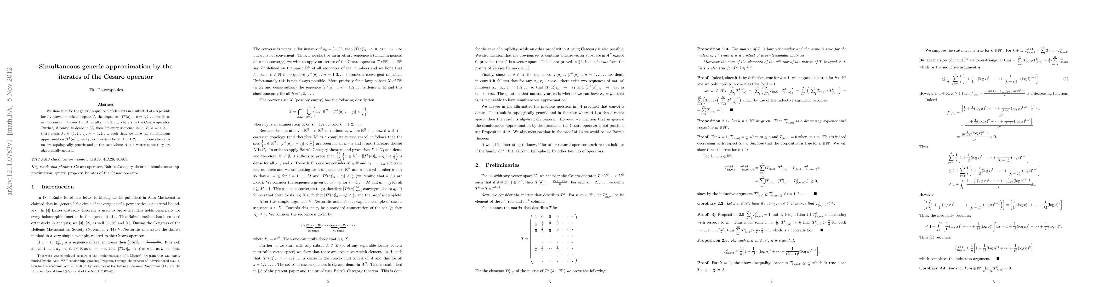 The paper shows that a generic sequence of elements in a subset A converges to all elements in the convex hull convA using the iterates of the Cesaro operator, leading to simultaneous approximation for any sequence in V.