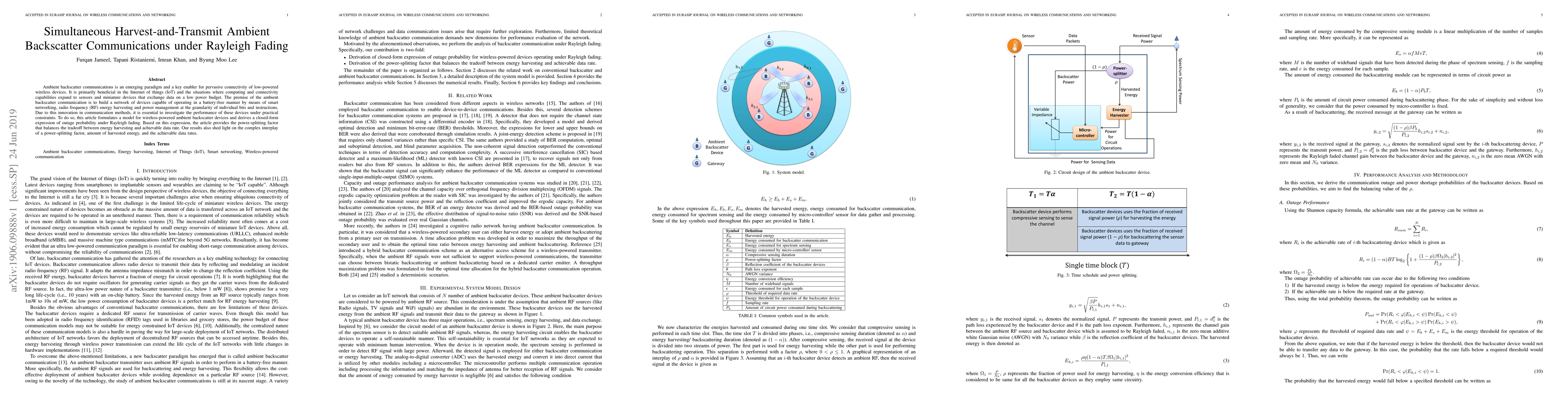 The paper formulates a model for wireless-powered ambient backscatter devices and derives a closed-form expression of outage probability under Rayleigh fading, providing the power-splitting factor that balances energy harvesting and achievable data rate.