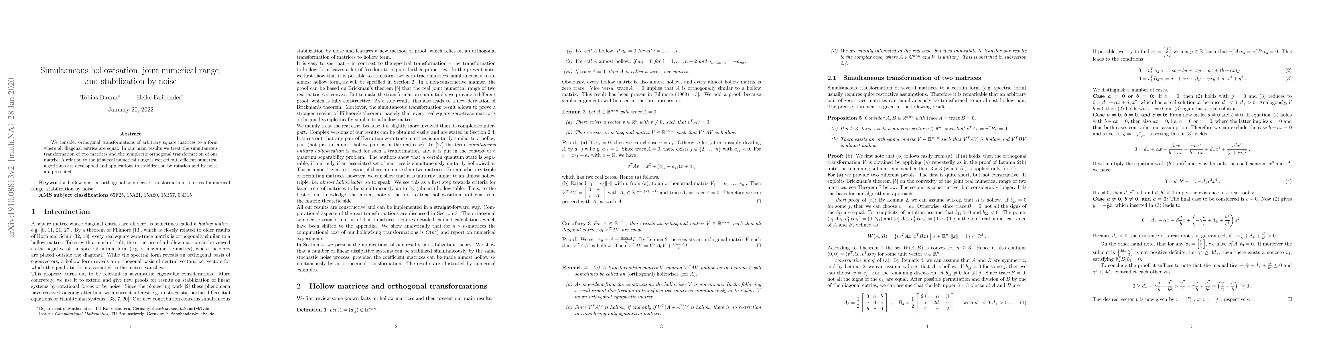 Researchers developed algorithms to simultaneously transform matrices to equal diagonal entries, relating it to joint real numerical range for applications in stabilization through rotation and noise.