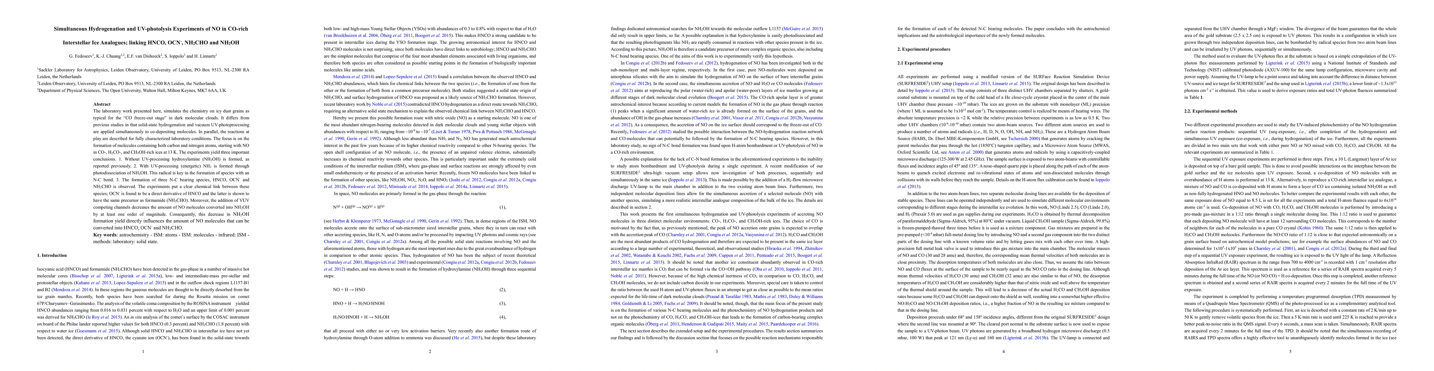 This study investigates the simultaneous hydrogenation and UV-photolysis of NO in CO-rich interstellar ice analogues, revealing the formation of NH2OH without UV-processing and NH2 with UV-processing, which is crucial for forming N-C bond species like HNCO, OCN-, and NH2CHO. The experiments establish a clear chemical link between these nitrogen-carbon compounds.