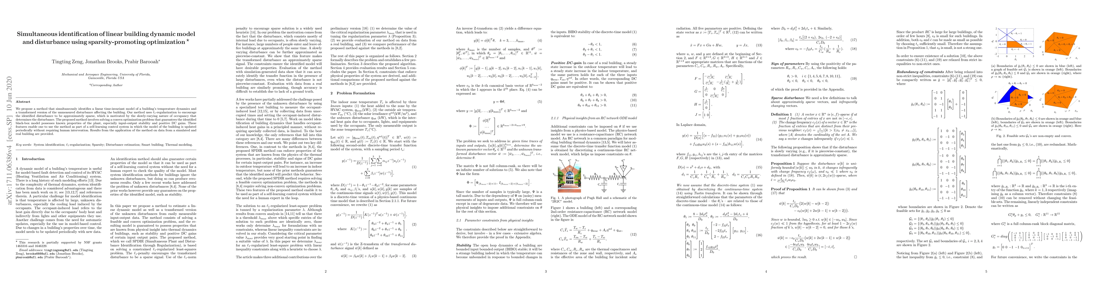 We propose a method that simultaneously identifies a linear time-invariant model of a building's temperature dynamics and a transformed version of the unmeasured disturbance affecting the building. Our method uses l1-regularization to encourage the identified disturbance to be approximately sparse, which is motivated by the slowly-varying nature of occupancy that determines the disturbance. The proposed method involves solving a convex optimization problem that guarantees the identified black-box model possesses known properties of the plant, especially input-output stability and positive DC gains. These features enable one to use the method as part of a self-learning control system in which the model of the building is updated periodically without requiring human intervention. Results from the application of the method on data from a simulated and real building are provided.