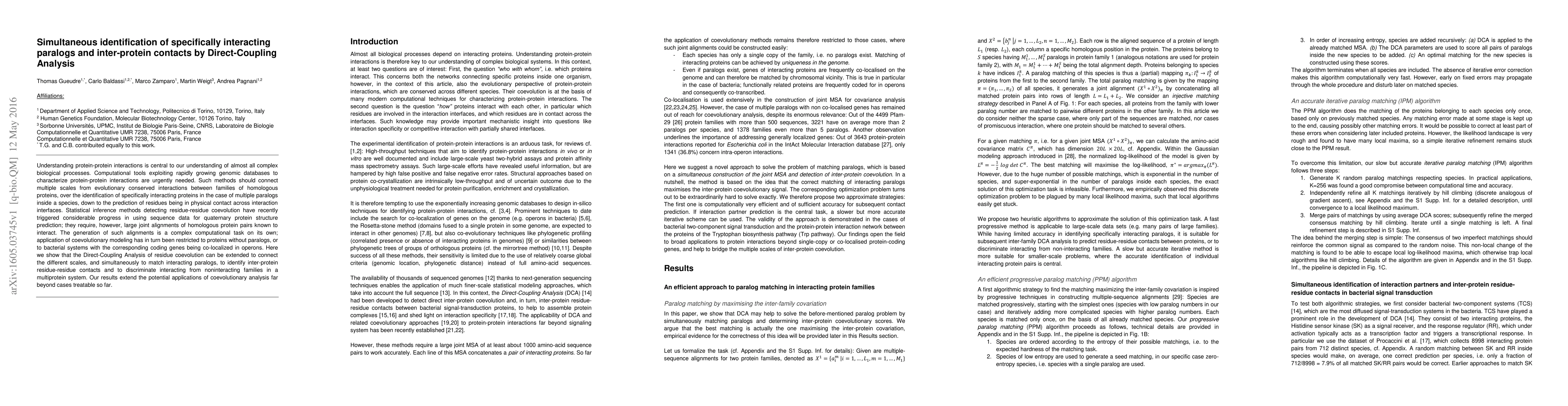This paper presents a method for simultaneously identifying specifically interacting paralogs and inter-protein contacts using Direct-Coupling Analysis of residue coevolution. It extends the application of coevolutionary modeling to multiprotein systems, overcoming previous limitations in handling paralogs and non-operon bacterial systems.