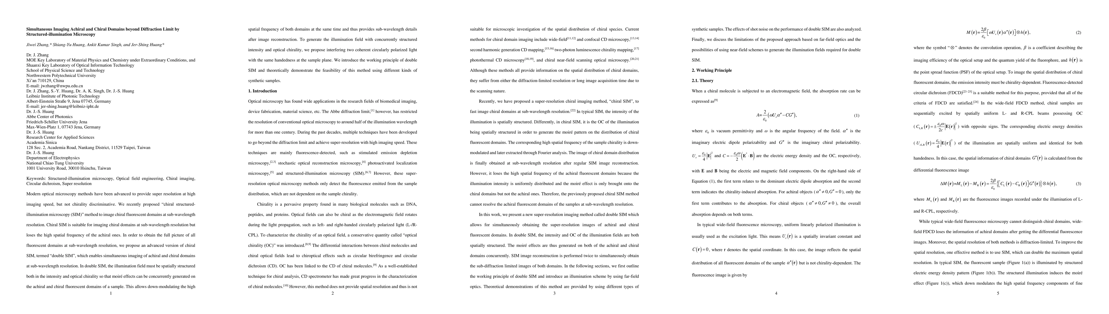 The paper proposes double SIM, an advanced microscopy technique that enables simultaneous imaging of both achiral and chiral fluorescent domains at sub-wavelength resolution by structuring illumination both in intensity and optical chirality. This method uses interfering circularly polarized light to generate the required illumination field, allowing for detailed reconstruction of both types of domains.
