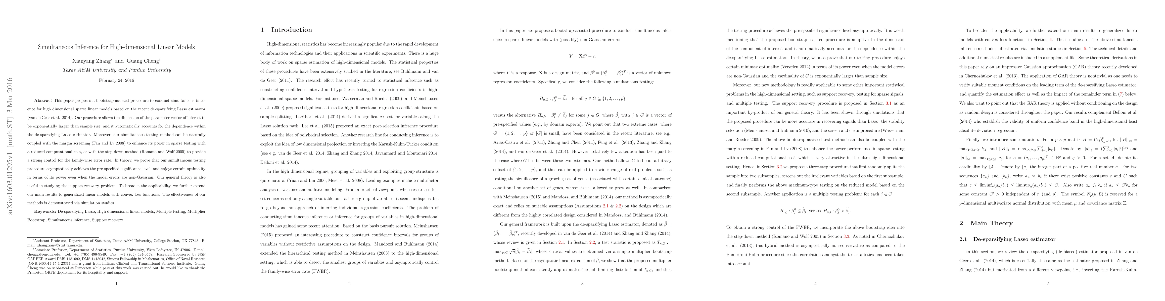 This paper introduces a bootstrap-assisted procedure for simultaneous inference in high-dimensional sparse linear models, leveraging the de-sparsifying Lasso estimator. It achieves strong control over error rates and maintains power even with non-Gaussian errors, extending applicability to generalized linear models.