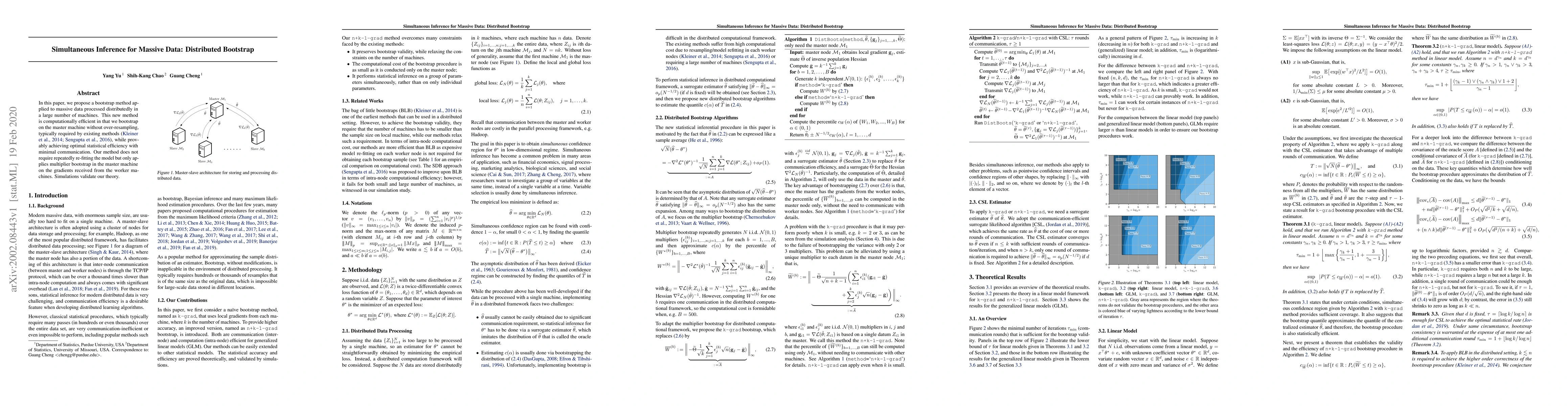 Researchers propose a distributed bootstrap method for processing massive data on multiple machines, achieving optimal statistical efficiency with minimal communication and no need for re-fitting the model.