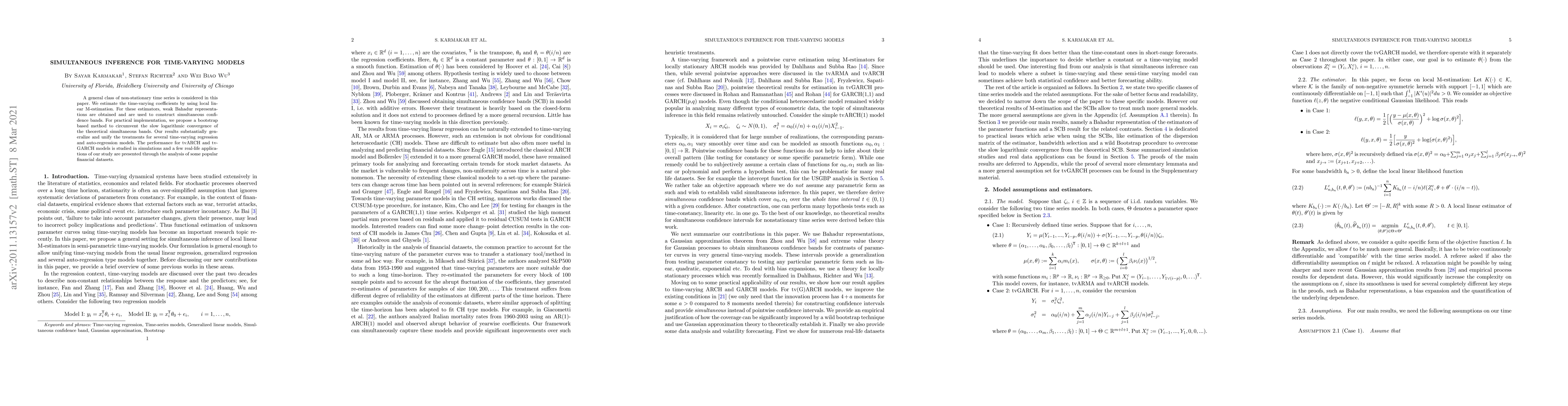 This paper develops simultaneous inference methods for time-varying regression models using local linear M-estimation and constructs simultaneous confidence bands via weak Bahadur representations. A bootstrap method is proposed to improve practical implementation, and the approach is applied to ARCH and GARCH models with positive results in simulations and real financial datasets.