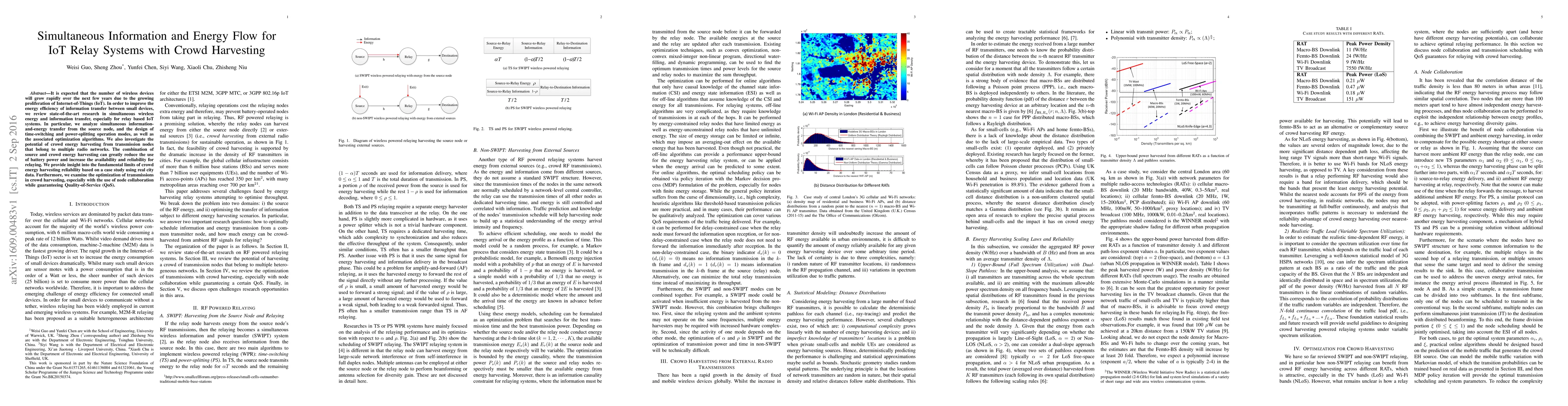 This paper reviews state-of-the-art research on simultaneous wireless energy and information transfer in IoT relay systems, focusing on time-switching and power-splitting techniques. It explores crowd energy harvesting from multiple radio networks to enhance energy efficiency and reliability, providing insights into the fundamental limits of crowd harvesting reliability based on real city data and examining optimization strategies for QoS.