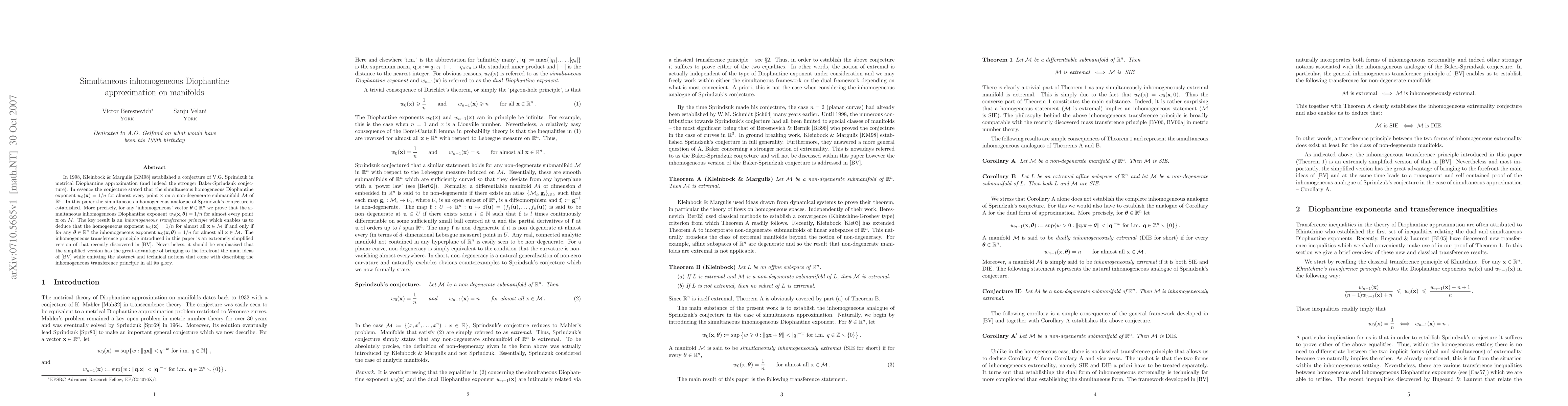 In 1998, Kleinbock & Margulis established a conjecture of V.G. Sprindzuk in metrical Diophantine approximation (and indeed the stronger Baker-Sprindzuk conjecture). In essence the conjecture stated that the simultaneous homogeneous Diophantine exponent $w_{0}(\vv x) = 1/n$ for almost every point $\vv x$ on a non-degenerate submanifold $\cM$ of $\R^n$. In this paper the simultaneous inhomogeneous analogue of Sprindzuk's conjecture is established. More precisely, for any `inhomogeneous' vector $\bm\theta\in\R^n$ we prove that the simultaneous inhomogeneous Diophantine exponent $w_{0}(\vv x, \bm\theta)= 1/n$ for almost every point $\vv x$ on $M$. The key result is an inhomogeneous transference principle which enables us to deduce that the homogeneous exponent $w_0(\vv x)=1/n$ for almost all $\vv x\in \cM$ if and only if for any $\bm\theta\in\R^n$ the inhomogeneous exponent $w_0(\vv x,\bm\theta)=1/n$ for almost all $\vv x\in \cM$. The inhomogeneous transference principle introduced in this paper is an extremely simplified version of that recently discovered in \cite{Beresnevich-Velani-new-inhom}. Nevertheless, it should be emphasised that the simplified version has the great advantage of bringing to the forefront the main ideas of \cite{Beresnevich-Velani-new-inhom} while omitting the abstract and technical notions that come with describing the inhomogeneous transference principle in all its glory.