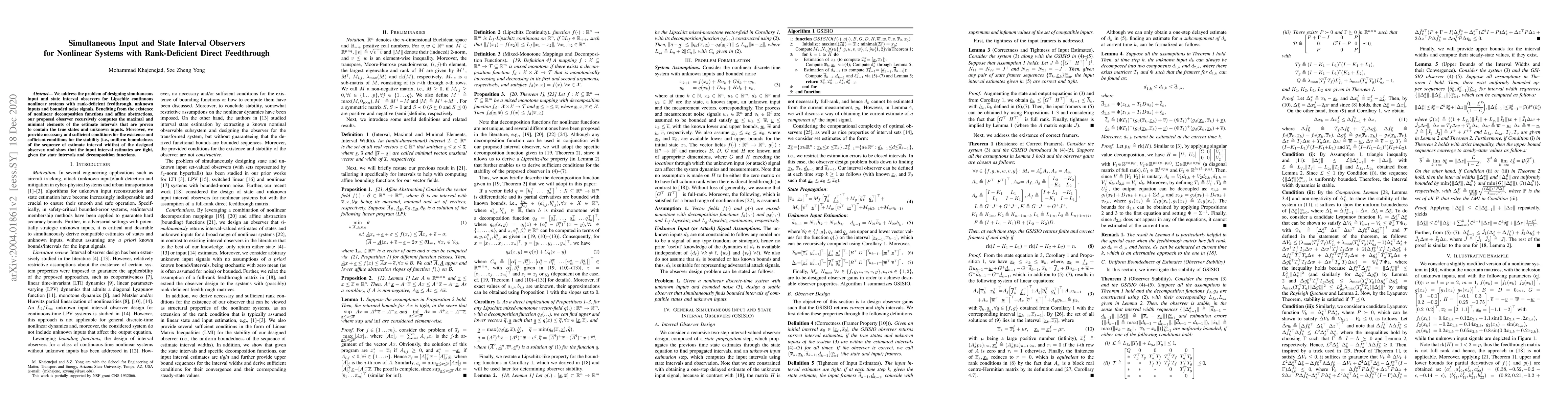 This paper proposes a method for designing simultaneous input and state interval observers for nonlinear systems with rank-deficient feedthrough, unknown inputs, and bounded noise. The observer uses nonlinear decomposition functions to recursively compute the maximal and minimal estimates, ensuring the true state and input values lie within the computed intervals.