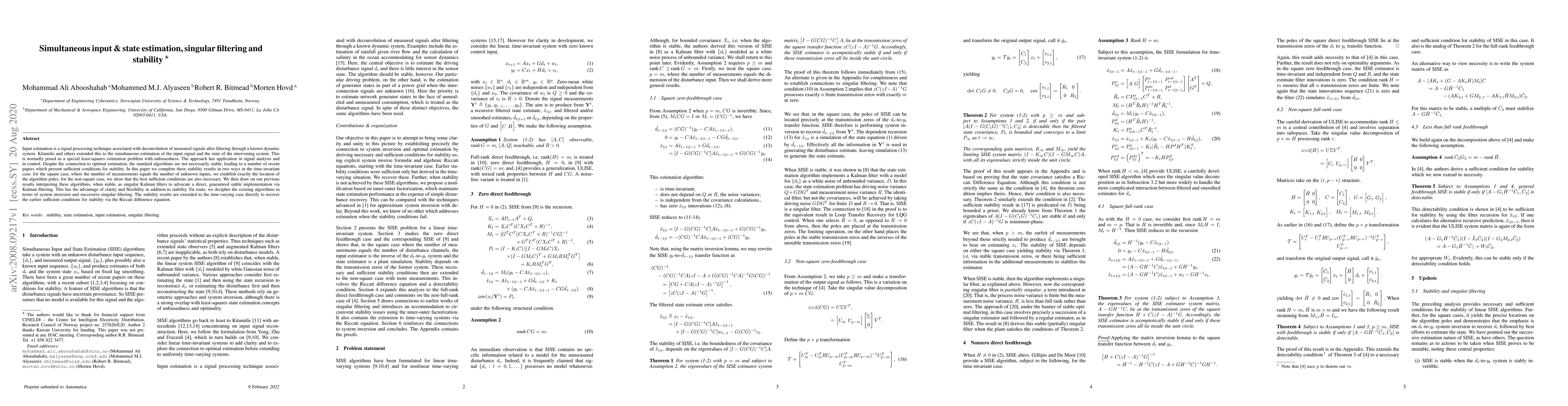 This paper addresses simultaneous input and state estimation, presenting stability conditions for singular filtering algorithms. It establishes exact pole locations for square cases and proves that best sufficient conditions are necessary for non-square cases, advocating for stable implementation via Kalman filtering for clarity and flexibility.