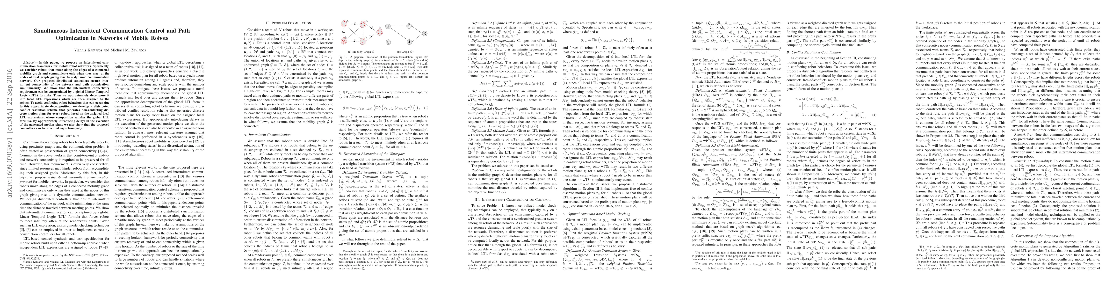 This paper proposes a framework for mobile robot networks that optimizes paths while ensuring intermittent communication through a distributed control system. The approach uses Linear Temporal Logic (LTL) to manage connectivity and employs a conflict resolution scheme to generate non-conflicting motion plans, allowing asynchronous execution.