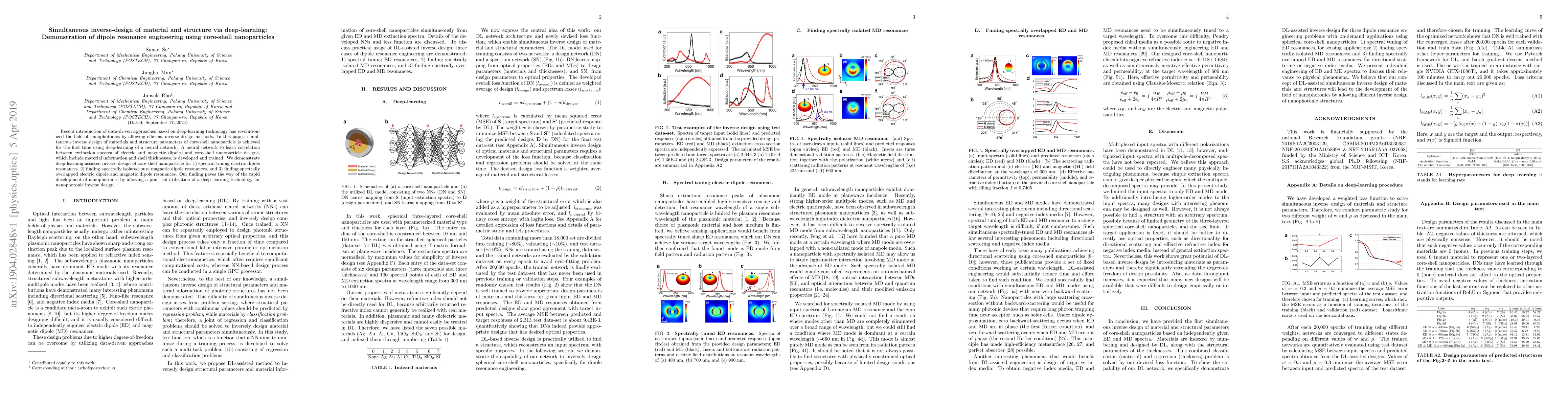 This paper presents a deep-learning approach for the simultaneous inverse design of core-shell nanoparticles, achieving material and structural parameter optimization. The method demonstrates spectral tuning of electric and magnetic dipole resonances, paving the way for advanced nanophotonic applications.