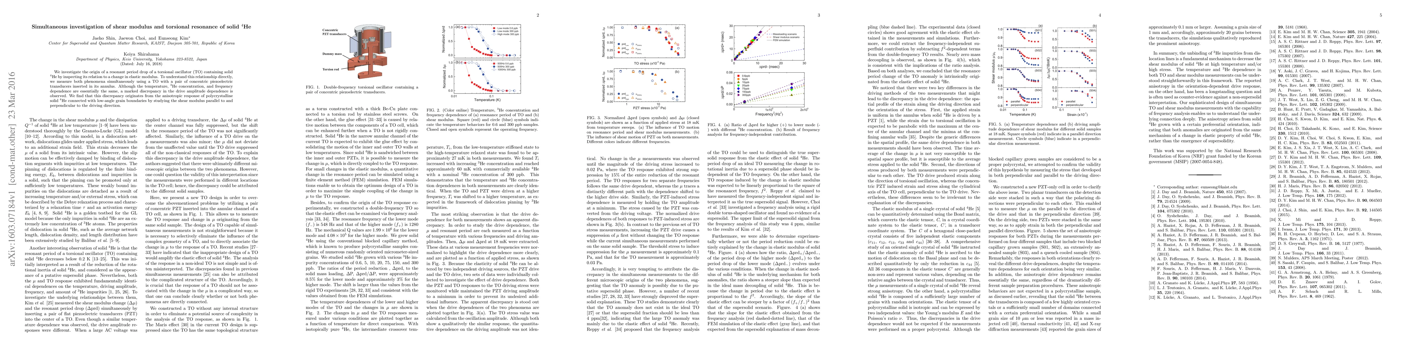We investigate the origin of a resonant period drop of a torsional oscillator (TO) containing solid ${}^{4}$He by inspecting its relation to a change in elastic modulus. To understand this relationship directly, we measure both phenomena simultaneously using a TO with a pair of concentric piezoelectric transducers inserted in its annulus. Although the temperature, ${}^{3}$He concentration, and frequency dependence are essentially the same, a marked discrepancy in the drive amplitude dependence is observed. We find that this discrepancy originates from the anisotropic response of polycrystalline solid ${}^{4}$He connected with low-angle grain boundaries by studying the shear modulus parallel to and perpendicular to the driving direction.