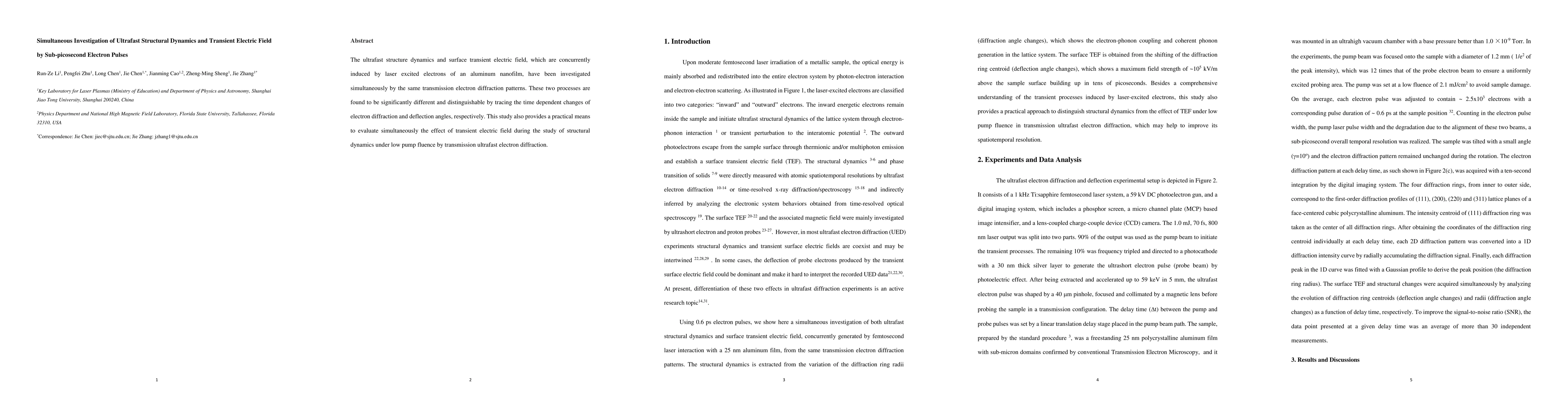 This paper investigates the simultaneous ultrafast structural dynamics and transient electric field in an aluminum nanofilm using sub-picosecond electron pulses. The study reveals distinct behaviors in these processes through time-dependent changes in electron diffraction and deflection angles, offering a method to assess transient electric fields during structural dynamics studies.
