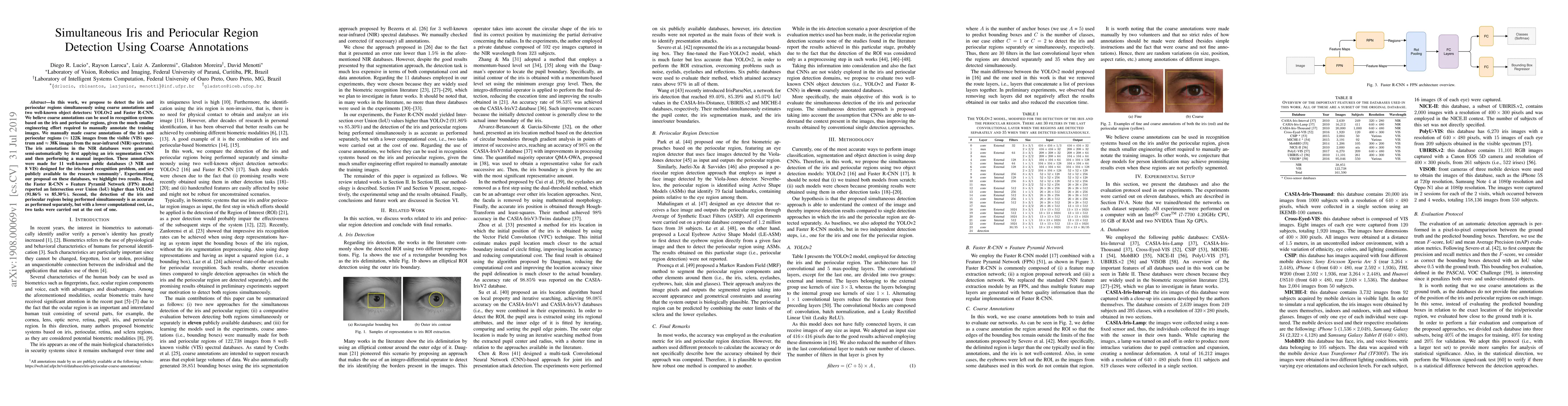 This paper proposes a method for simultaneous detection of iris and periocular regions using coarse annotations and object detectors YOLOv2 and Faster R-CNN. Experiments show that Faster R-CNN with FPN achieves higher accuracy (91.86% IoU) than YOLOv2 (85.30% IoU) and that simultaneous detection is as accurate as separate detection but with lower computational cost.