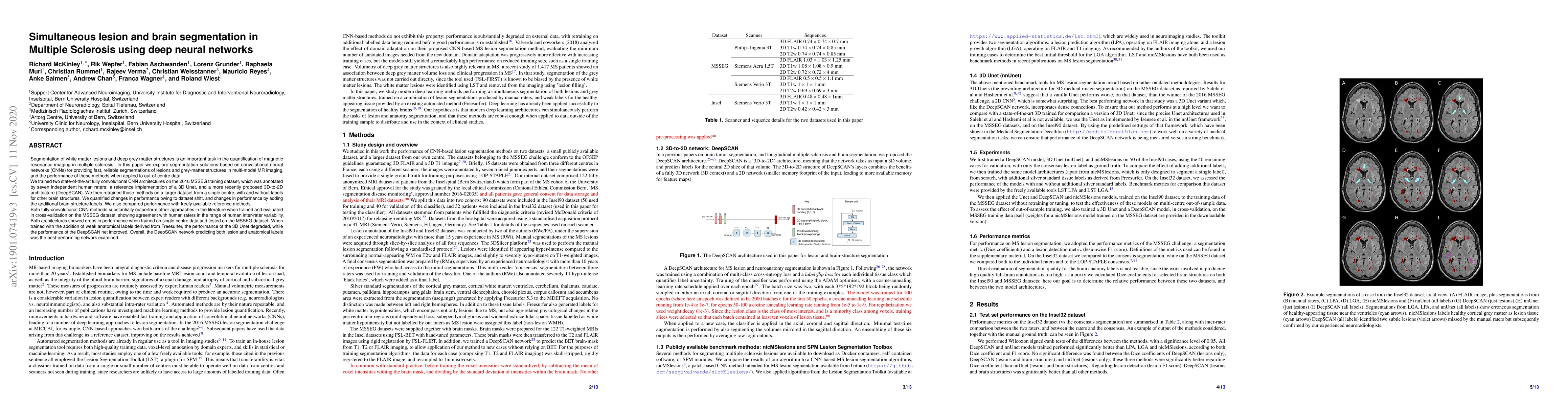 Segmentation of white matter lesions and deep grey matter structures is an important task in the quantification of magnetic resonance imaging in multiple sclerosis. In this paper we explore segmentation solutions based on convolutional neural networks (CNNs) for providing fast, reliable segmentations of lesions and grey-matter structures in multi-modal MR imaging, and the performance of these methods when applied to out-of-centre data. We trained two state-of-the-art fully convolutional CNN architectures on the 2016 MSSEG training dataset, which was annotated by seven independent human raters: a reference implementation of a 3D Unet, and a more recently proposed 3D-to-2D architecture (DeepSCAN). We then retrained those methods on a larger dataset from a single centre, with and without labels for other brain structures. We quantified changes in performance owing to dataset shift, and changes in performance by adding the additional brain-structure labels. We also compared performance with freely available reference methods. Both fully-convolutional CNN methods substantially outperform other approaches in the literature when trained and evaluated in cross-validation on the MSSEG dataset, showing agreement with human raters in the range of human inter-rater variability. Both architectures showed drops in performance when trained on single-centre data and tested on the MSSEG dataset. When trained with the addition of weak anatomical labels derived from Freesurfer, the performance of the 3D Unet degraded, while the performance of the DeepSCAN net improved. Overall, the DeepSCAN network predicting both lesion and anatomical labels was the best-performing network examined.