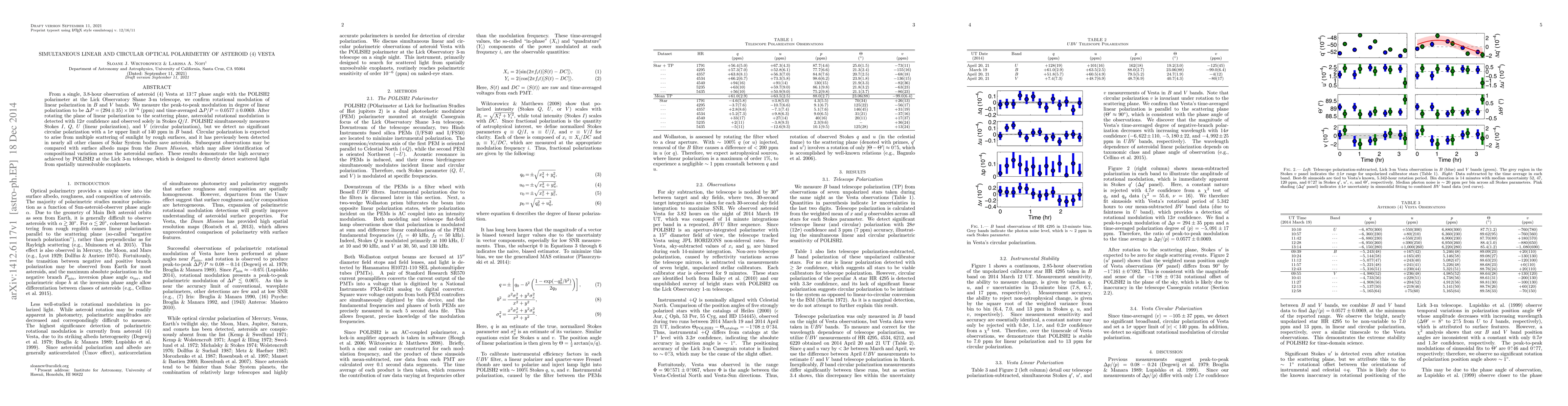 From a single, 3.8-hour observation of asteroid (4) Vesta at $13.7^\circ$ phase angle with the POLISH2 polarimeter at the Lick Observatory Shane 3-m telescope, we confirm rotational modulation of linear polarization in $B$ and $V$ bands. We measure the peak-to-peak modulation in degree of linear polarization to be $\Delta P = (294 \pm 35) \times 10^{-6}$ (ppm) and time-averaged $\Delta P / P = 0.0577 \pm 0.0069$. After rotating the plane of linear polarization to the scattering plane, asteroidal rotational modulation is detected with $12 \sigma$ confidence and observed solely in Stokes $Q/I$. POLISH2 simultaneously measures Stokes $I$, $Q$, $U$ (linear polarization), and $V$ (circular polarization), but we detect no significant circular polarization with a $1 \sigma$ upper limit of 140 ppm in $B$ band. Circular polarization is expected to arise from multiple scattering of sunlight by rough surfaces, and it has previously been detected in nearly all other classes of Solar System bodies save asteroids. Subsequent observations may be compared with surface albedo maps from the Dawn Mission, which may allow identification of compositional variation across the asteroidal surface. These results demonstrate the high accuracy achieved by POLISH2 at the Lick 3-m telescope, which is designed to directly detect scattered light from spatially unresolvable exoplanets.