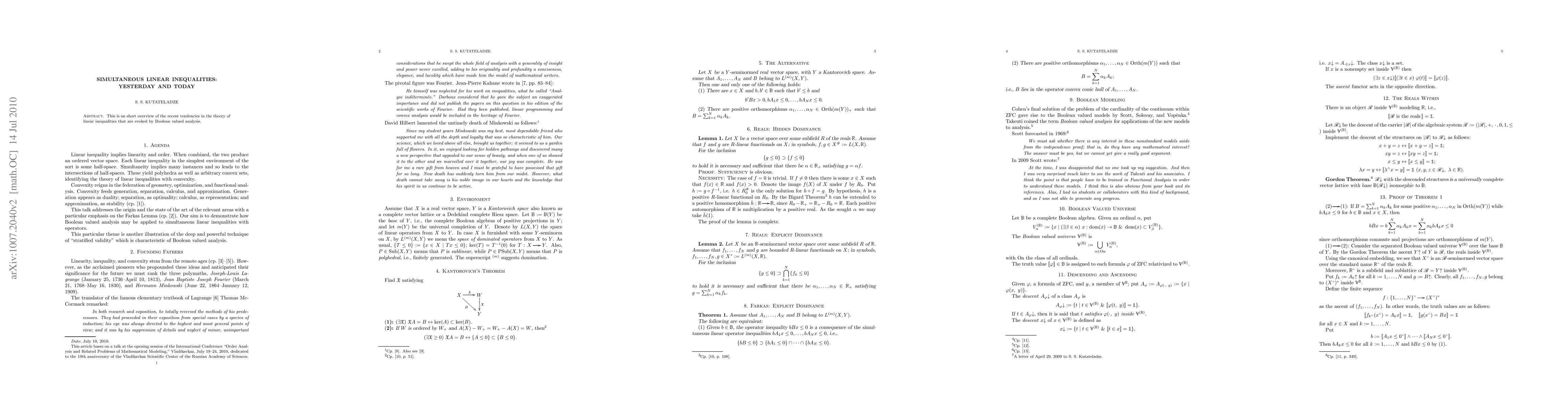 This paper explores recent developments in the theory of linear inequalities, focusing on Boolean valued analysis. Key findings highlight tendencies in the field, providing insight into its ongoing evolution and implications for mathematical research.