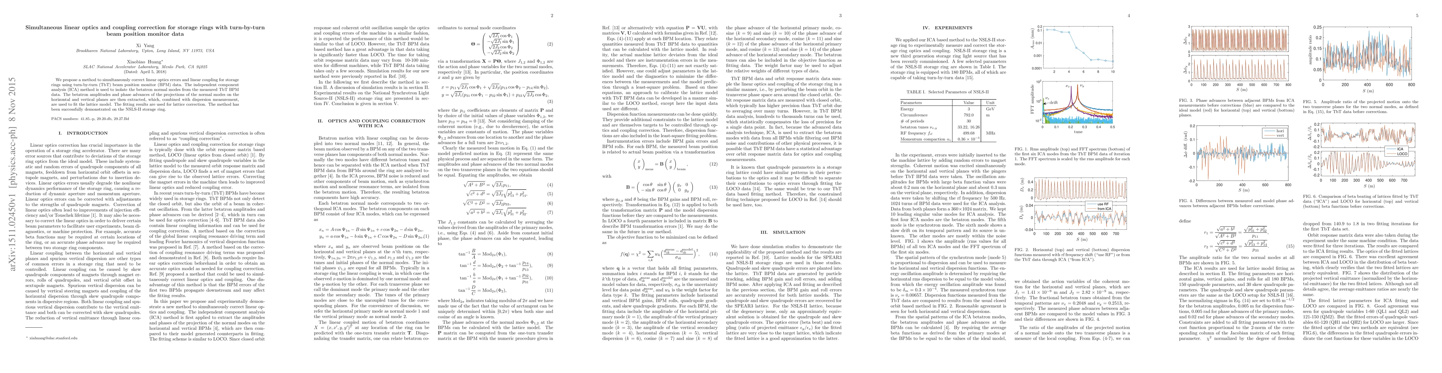 This paper proposes a method to correct linear optics errors and coupling in storage rings using turn-by-turn beam position monitor data. It employs independent component analysis to extract betatron normal modes and uses these to fit and correct the lattice model, demonstrated successfully on the NSLS-II storage ring.