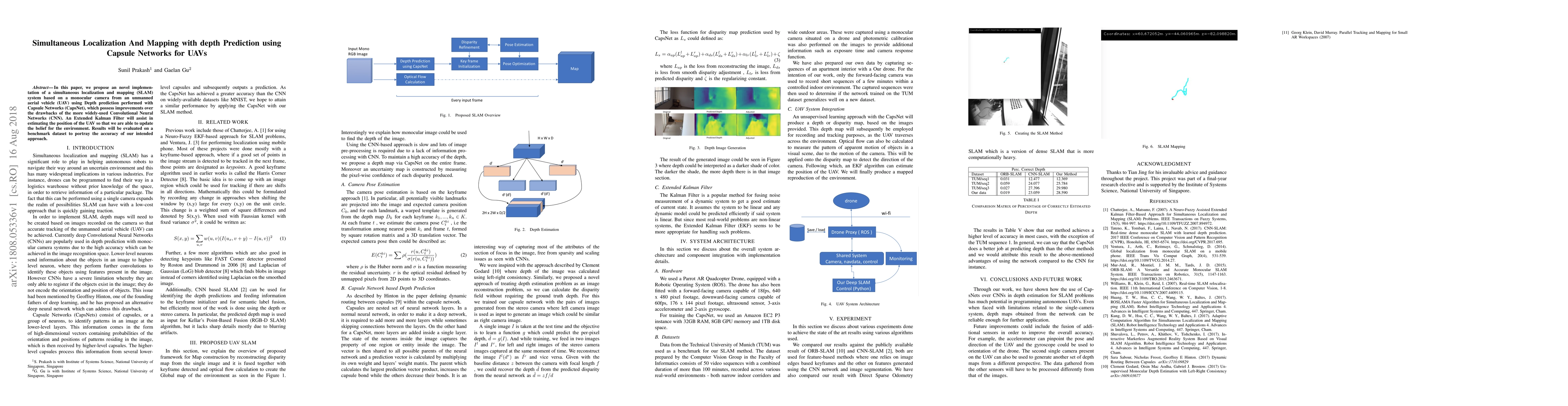 This paper introduces a SLAM system for UAVs using a monocular camera and depth prediction with Capsule Networks, which offers advantages over traditional CNNs. An Extended Kalman Filter aids in UAV position estimation, and results are evaluated on a benchmark dataset to assess accuracy.