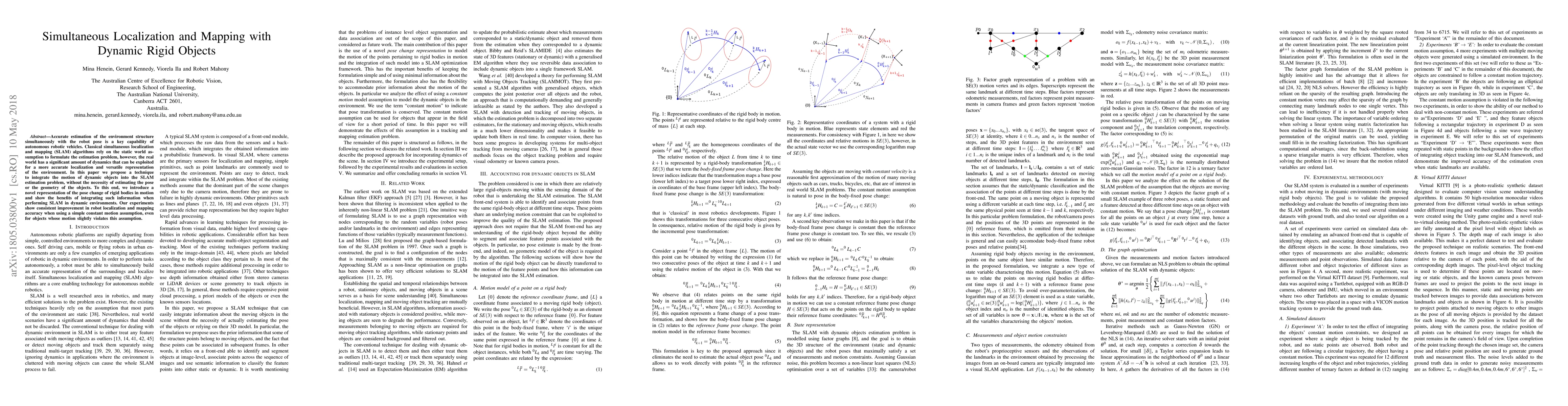 Accurate estimation of the environment structure simultaneously with the robot pose is a key capability of autonomous robotic vehicles. Classical simultaneous localization and mapping (SLAM) algorithms rely on the static world assumption to formulate the estimation problem, however, the real world has a significant amount of dynamics that can be exploited for a more accurate localization and versatile representation of the environment. In this paper we propose a technique to integrate the motion of dynamic objects into the SLAM estimation problem, without the necessity of estimating the pose or the geometry of the objects. To this end, we introduce a novel representation of the pose change of rigid bodies in motion and show the benefits of integrating such information when performing SLAM in dynamic environments. Our experiments show consistent improvement in robot localization and mapping accuracy when using a simple constant motion assumption, even for objects whose motion slightly violates this assumption.