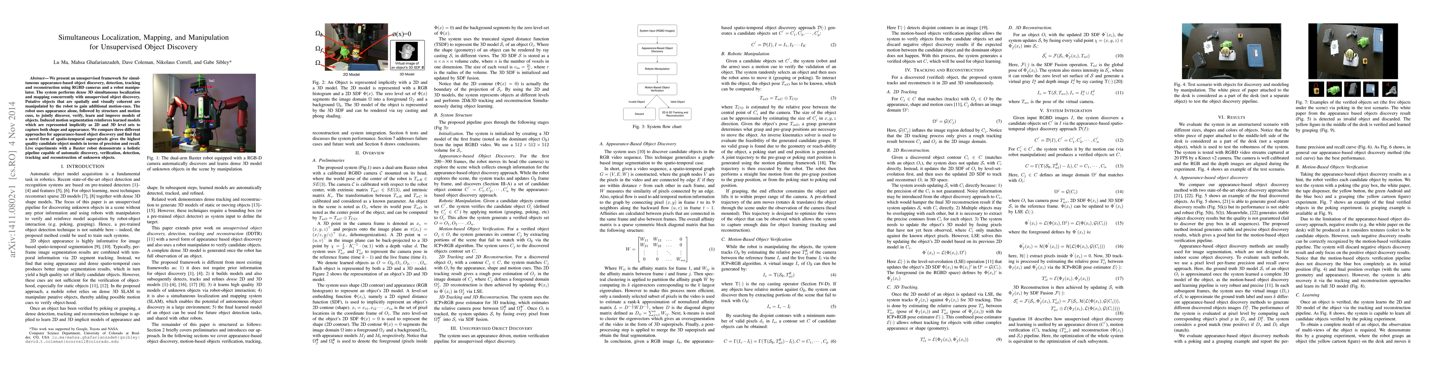 We present an unsupervised framework for simultaneous appearance-based object discovery, detection, tracking and reconstruction using RGBD cameras and a robot manipulator. The system performs dense 3D simultaneous localization and mapping concurrently with unsupervised object discovery. Putative objects that are spatially and visually coherent are manipulated by the robot to gain additional motion-cues. The robot uses appearance alone, followed by structure and motion cues, to jointly discover, verify, learn and improve models of objects. Induced motion segmentation reinforces learned models which are represented implicitly as 2D and 3D level sets to capture both shape and appearance. We compare three different approaches for appearance-based object discovery and find that a novel form of spatio-temporal super-pixels gives the highest quality candidate object models in terms of precision and recall. Live experiments with a Baxter robot demonstrate a holistic pipeline capable of automatic discovery, verification, detection, tracking and reconstruction of unknown objects.