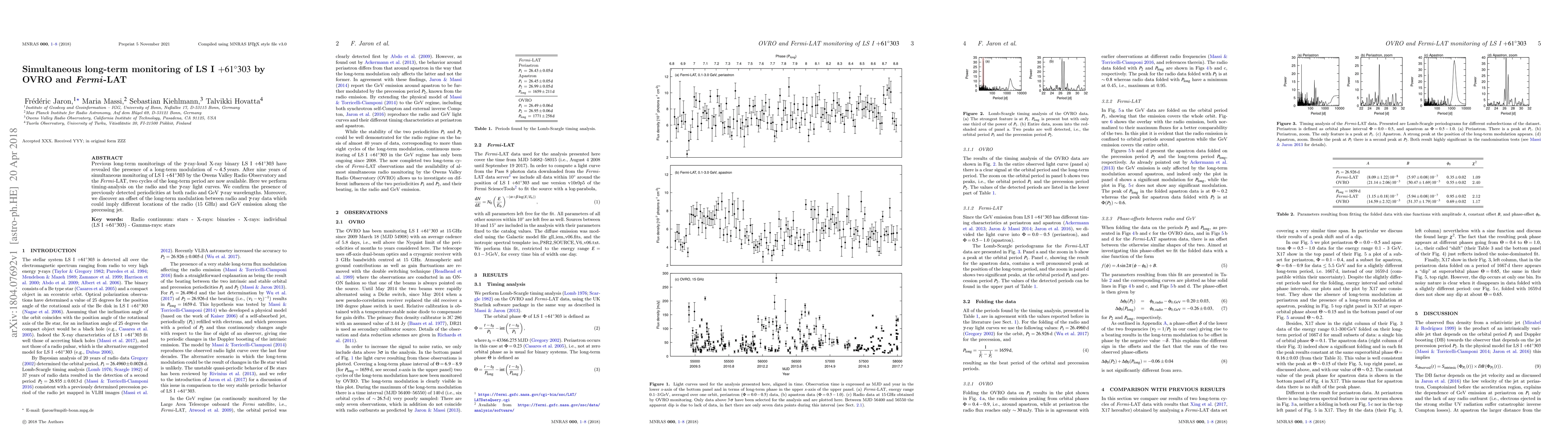 This study confirms long-term modulation periods of ~4.5 years in LS I +61{deg}303 using simultaneous radio (Owens Valley Radio Observatory) and gamma-ray (Fermi-LAT) monitoring for nine years. It reveals distinct periodicities at both wavelengths and an offset suggesting potentially different emission locations along the precessing jet for radio and gamma-ray emissions.