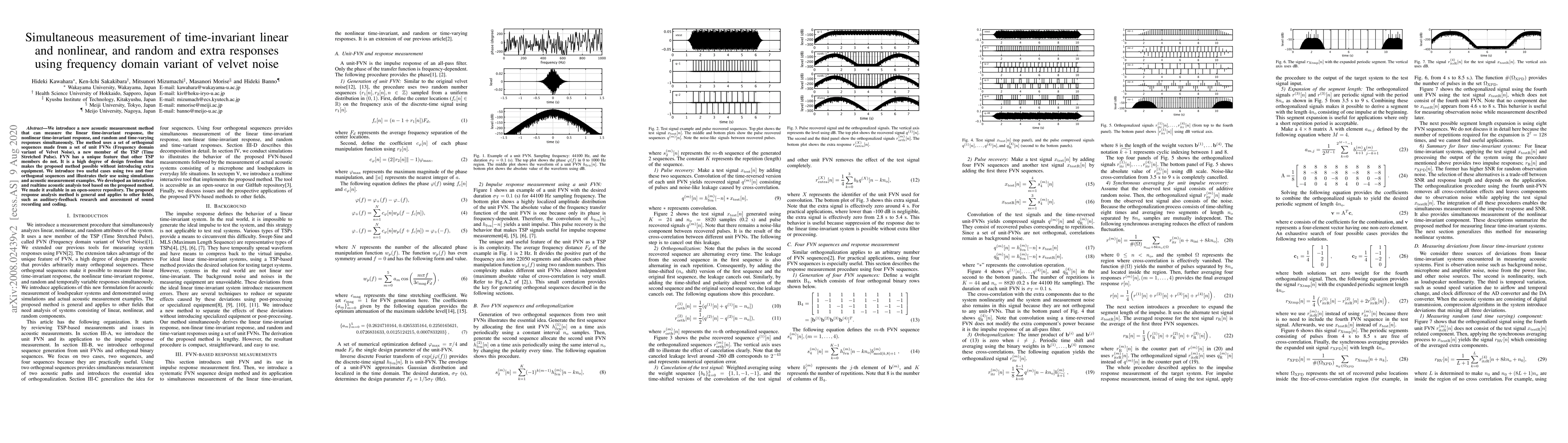 We introduce a new acoustic measurement method that can measure the linear time-invariant response, the nonlinear time-invariant response, and random and time-varying responses simultaneously. The method uses a set of orthogonal sequences made from a set of unit FVNs (Frequency domain variant of Velvet Noise), a new member of the TSP (Time Stretched Pulse). FVN has a unique feature that other TSP members do not. It is a high degree of design freedom that makes the proposed method possible without introducing extra equipment. We introduce two useful cases using two and four orthogonal sequences and illustrates their use using simulations and acoustic measurement examples. We developed an interactive and realtime acoustic analysis tool based on the proposed method. We made it available in an open-source repository. The proposed response analysis method is general and applies to other fields, such as auditory-feedback research and assessment of sound recording and coding.
