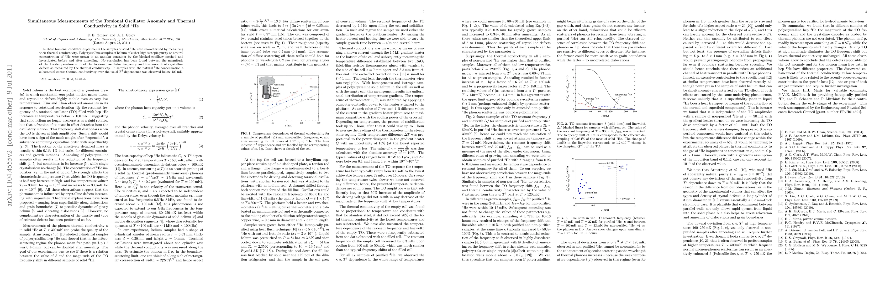 This paper investigates the torsional oscillator anomaly and thermal conductivity in solid $^4$He, finding no correlation between the torsional frequency shift and crystalline defects. It also reports a significant excess thermal conductivity in samples with natural $^3$He concentration below 120 mK.