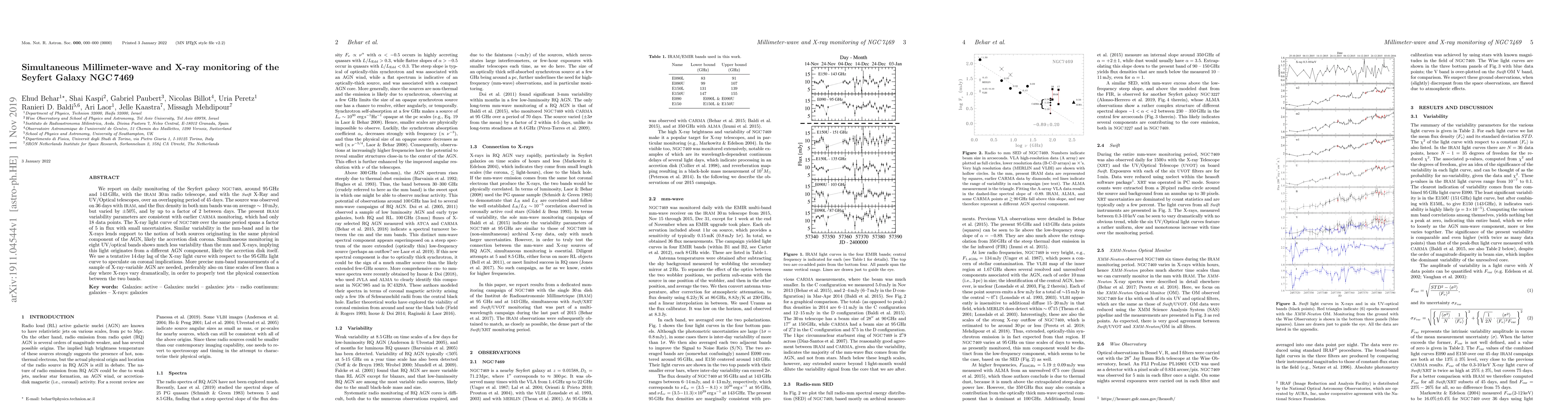 We report on daily monitoring of the Seyfert galaxy NGC 7469, around 95 GHz and 143 GHz, with the IRAM 30 m radio telescope, and with the Swift X-Ray and UV/Optical telescopes, over an overlapping period of 45 days. The source was observed on 36 days with IRAM, and the flux density in both mm bands was on average $\sim 10$ mJy, but varied by $\pm50\%$, and by up to a factor of 2 between days. The present IRAM variability parameters are consistent with earlier CARMA monitoring, which had only 18 data points. The X-ray light curve of NGC 7469 over the same period spans a factor of 5 in flux with small uncertainties. Similar variability in the mm-band and in the X-rays lends support to the notion of both sources originating in the same physical component of the AGN, likely the accretion disk corona. Simultaneous monitoring in eight UV/optical bands shows much less variability than the mm and X-rays, implying this light originates from a different AGN component, likely the accretion disk itself. We use a tentative 14 day lag of the X-ray light curve with respect to the 95 GHz light curve to speculate on coronal implications. More precise mm-band measurements of a sample of X-ray-variable AGN are needed, preferably also on time scales of less than a day where X-rays vary dramatically, in order to properly test the physical connection between the two bands.