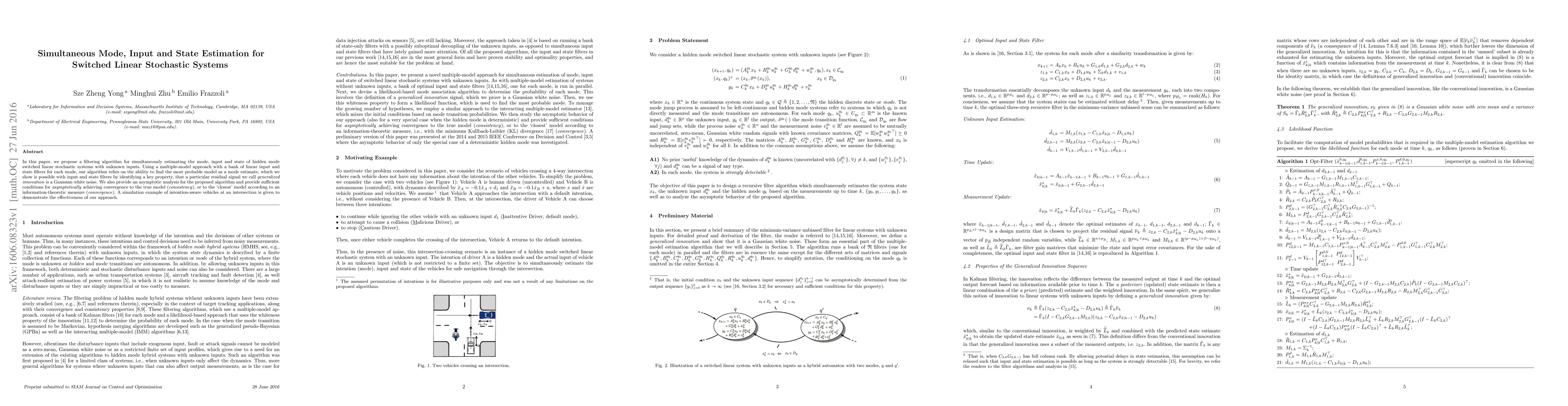This paper proposes a filtering algorithm for estimating the mode, input, and state of switched linear stochastic systems with unknown inputs. It uses a multiple-model approach with a bank of filters per mode, leveraging a Gaussian white noise property of a generalized innovation signal for mode estimation, and provides conditions for asymptotic convergence.