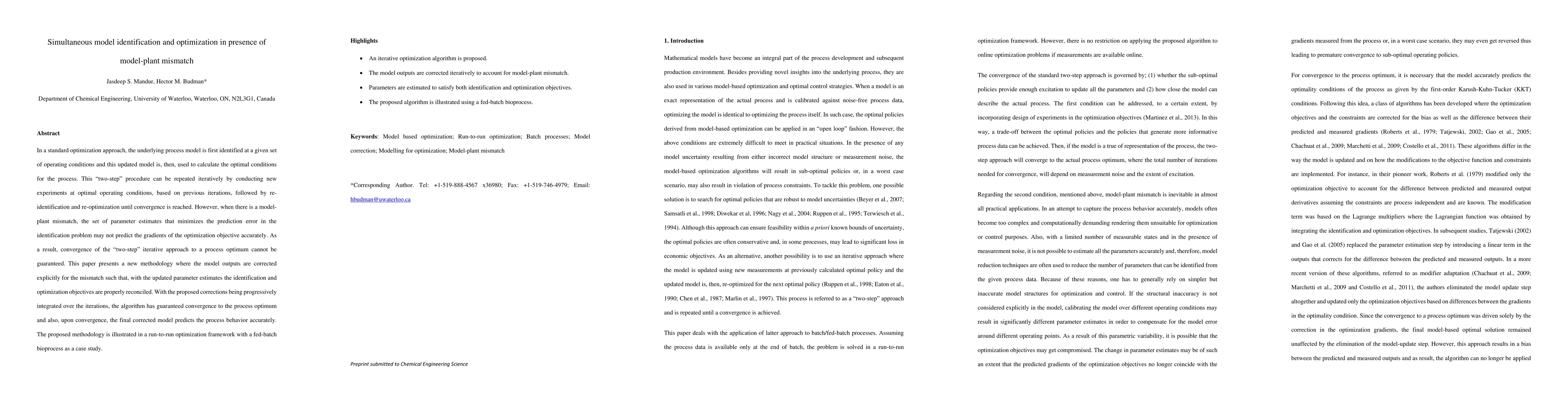 A new methodology corrects for model-plant mismatch in simultaneous model identification and optimization, ensuring guaranteed convergence to the process optimum. This approach reconciles identification and optimization objectives, predicting accurate process behavior upon convergence.