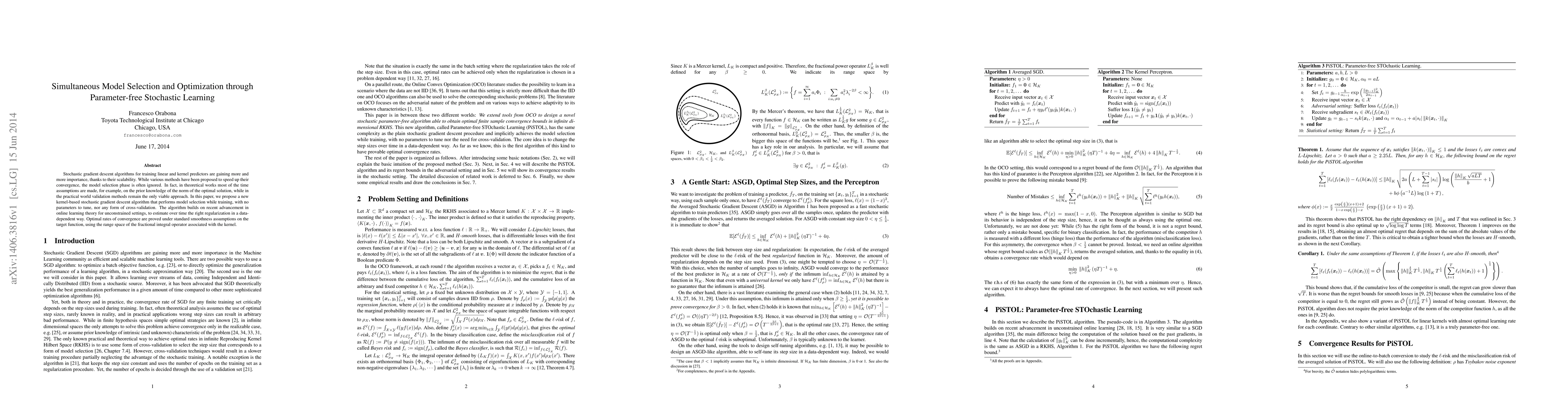 Stochastic gradient descent algorithms for training linear and kernel predictors are gaining more and more importance, thanks to their scalability. While various methods have been proposed to speed up their convergence, the model selection phase is often ignored. In fact, in theoretical works most of the time assumptions are made, for example, on the prior knowledge of the norm of the optimal solution, while in the practical world validation methods remain the only viable approach. In this paper, we propose a new kernel-based stochastic gradient descent algorithm that performs model selection while training, with no parameters to tune, nor any form of cross-validation. The algorithm builds on recent advancement in online learning theory for unconstrained settings, to estimate over time the right regularization in a data-dependent way. Optimal rates of convergence are proved under standard smoothness assumptions on the target function, using the range space of the fractional integral operator associated with the kernel.