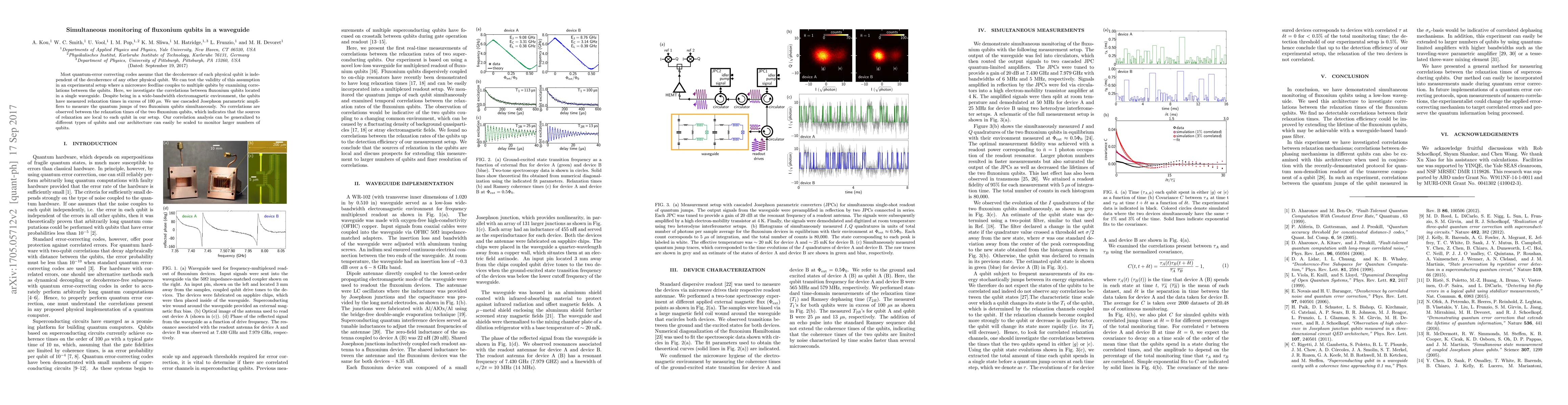 Most quantum-error correcting codes assume that the decoherence of each physical qubit is independent of the decoherence of any other physical qubit. We can test the validity of this assumption in an experimental setup where a microwave feedline couples to multiple qubits by examining correlations between the qubits. Here, we investigate the correlations between fluxonium qubits located in a single waveguide. Despite being in a wide-bandwidth electromagnetic environment, the qubits have measured relaxation times in excess of 100 us. We use cascaded Josephson parametric amplifiers to measure the quantum jumps of two fluxonium qubits simultaneously. No correlations are observed between the relaxation times of the two fluxonium qubits, which indicates that the sources of relaxation are local to each qubit. Our architecture can easily be scaled to monitor larger numbers of qubits.