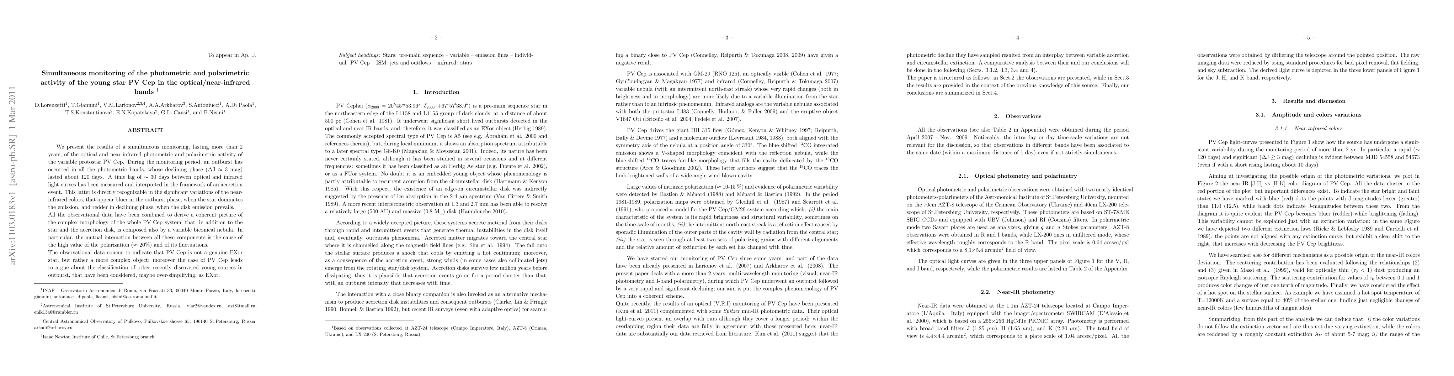 This study presents a comprehensive monitoring of the variable protostar PV Cep over two years, revealing an outburst with a 3 mag decline lasting 120 days. The analysis shows a 30-day time lag between optical and infrared light curves, indicative of an accretion event, and highlights the complex interactions within the PV Cep system, including the star, accretion disk, and biconical nebula, which contribute to the star's high polarization levels.