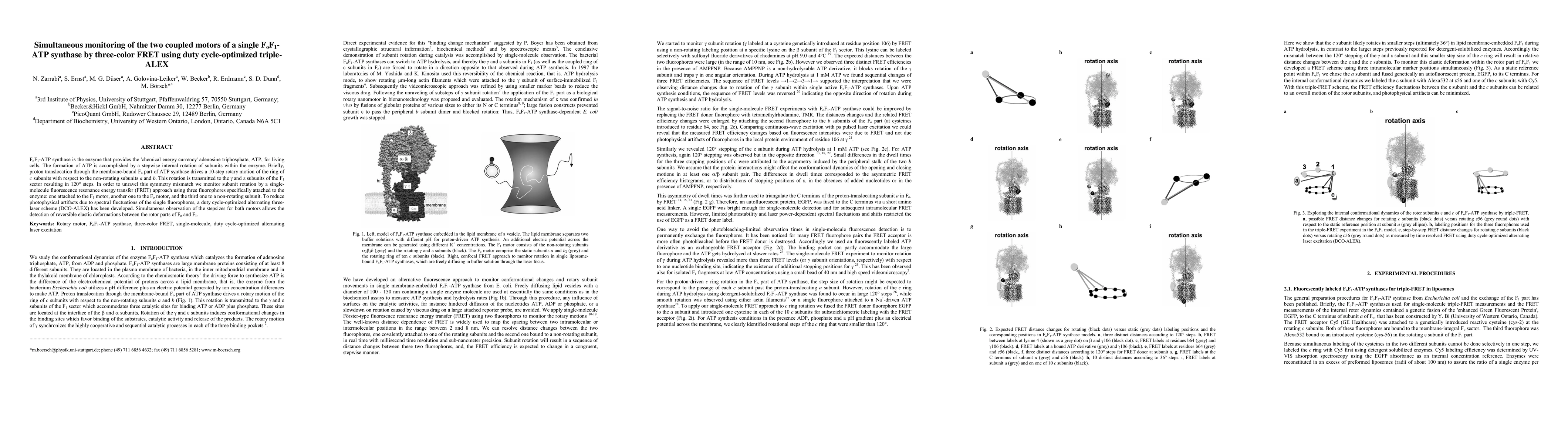 This paper presents a method for simultaneous monitoring of the two coupled motors within a single FoF1-ATP synthase enzyme using three-color FRET and a duty cycle-optimized triple-ALEX technique, allowing detection of reversible elastic deformations between the Fo and F1 rotor parts. The study employs three fluorophores to track the rotation of the Fo and F1 sectors, minimizing photophysical artifacts through a specialized alternating laser excitation scheme.