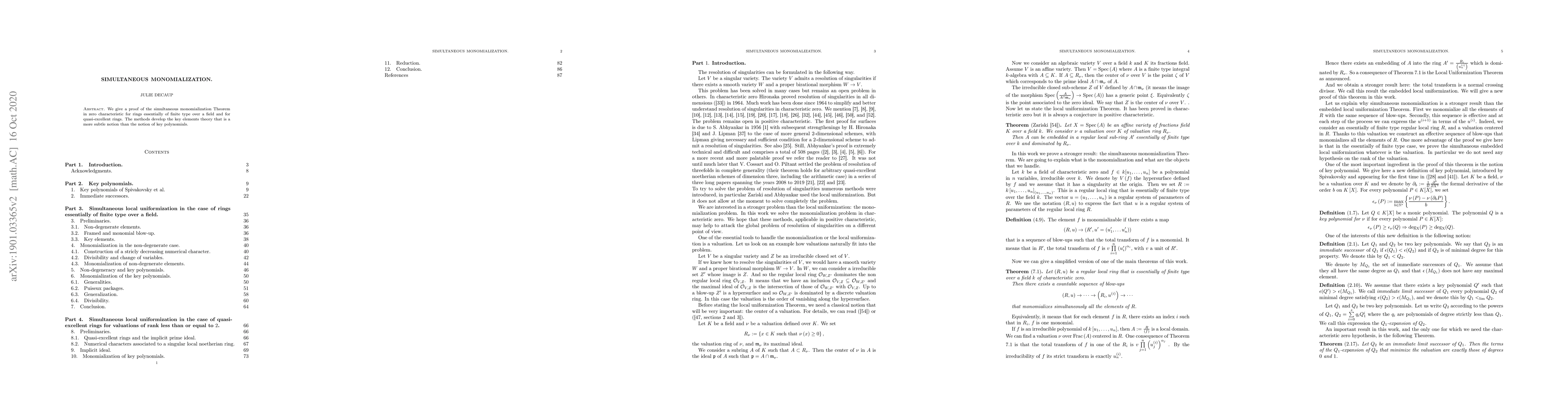 We give a new proof of the simultaneous embedded local uniformization Theorem in zero characteristic for essentially of finite type rings and for quasi excellent rings. The results are a consequence of the simultaneaous monomialization presented here. The methods develop the key elements theory that is a more subtle notion than the notion of key polynomials.