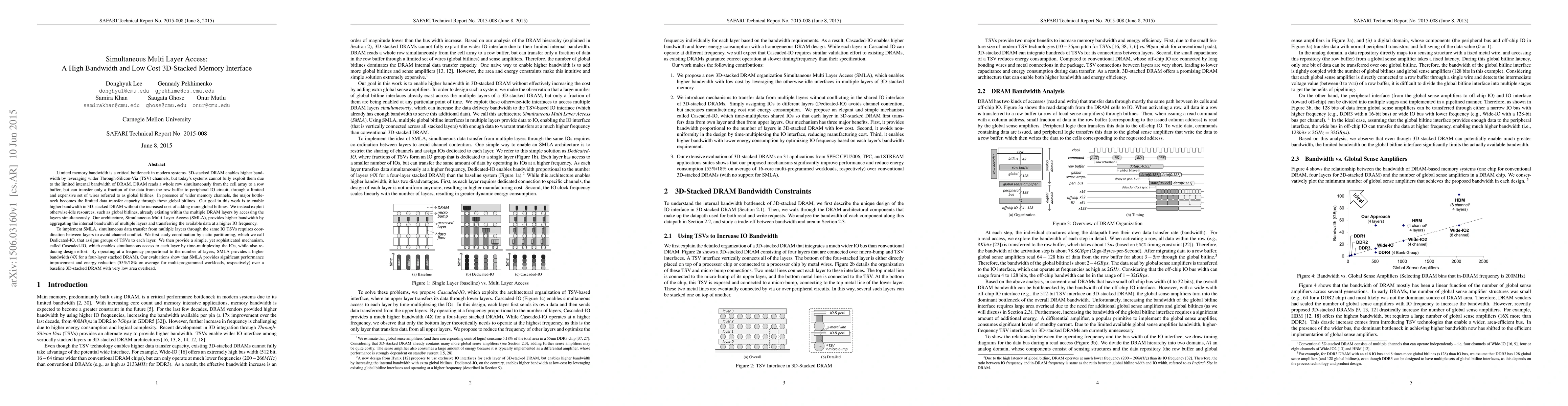 This paper proposes Simultaneous Multi Layer Access (SMLA) to enhance bandwidth in 3D-stacked DRAM by leveraging multiple layers' internal bandwidth simultaneously. The SMLA architecture uses coordination mechanisms like Dedicated-IO and Cascaded-IO to manage simultaneous data transfers, achieving up to 4X higher bandwidth with significant performance and energy improvements over traditional 3D-stacked DRAM.