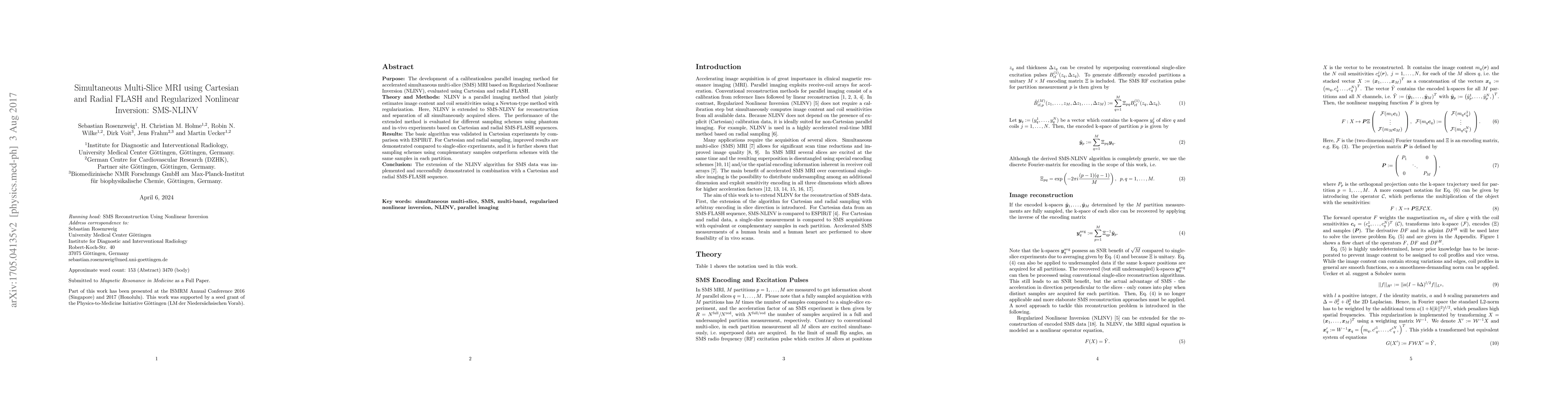 This paper develops a calibrationless parallel imaging method called SMS-NLINV for accelerated simultaneous multi-slice MRI, utilizing Regularized Nonlinear Inversion. The method is evaluated using Cartesian and radial FLASH sequences, showing improved results compared to single-slice experiments and demonstrating that complementary sampling schemes yield better outcomes.