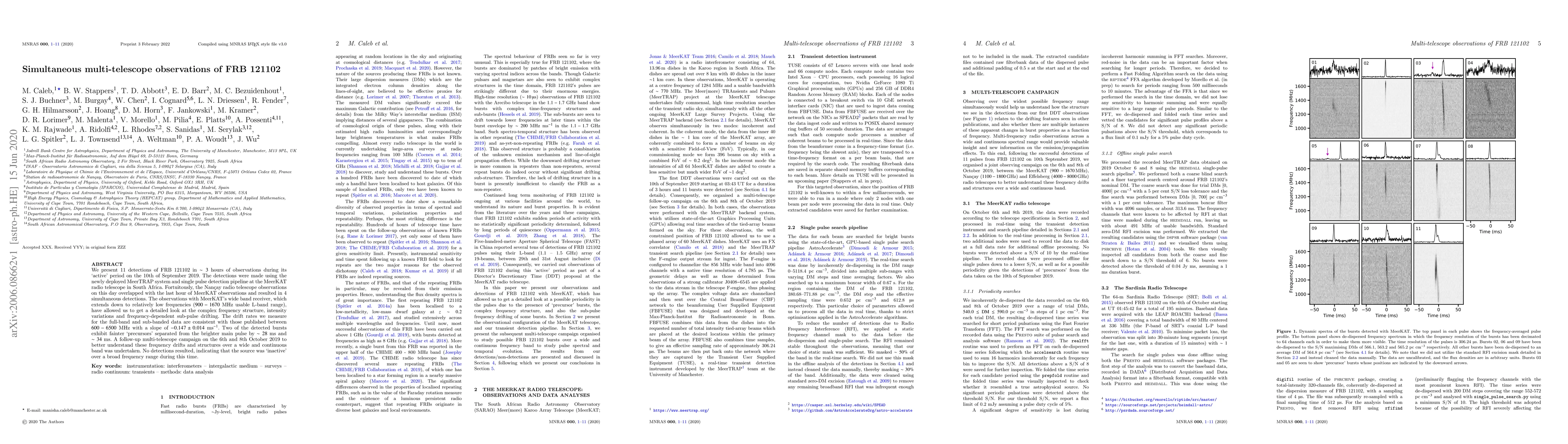 This study presents 11 detections of FRB 121102 using the MeerTRAP system and MeerKAT radio telescope, revealing complex frequency structures and intensity variations with a consistent drift rate over multiple frequencies.