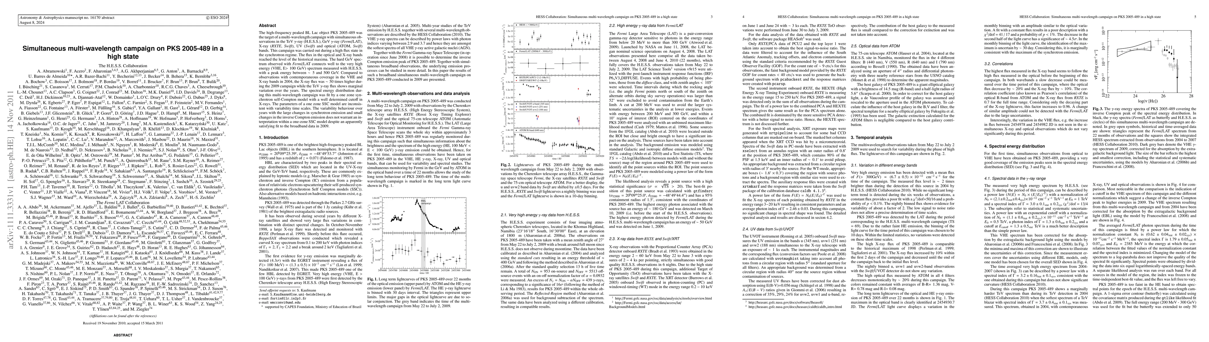 The high-frequency peaked BL Lac object PKS 2005-489 was the target of a multi-wavelength campaign with simultaneous observations in the TeV gamma-ray (H.E.S.S.), GeV gamma-ray (Fermi/LAT), X-ray (RXTE, Swift), UV (Swift) and optical (ATOM, Swift) bands. This campaign was carried out during a high flux state in the synchrotron regime. The flux in the optical and X-ray bands reached the level of the historical maxima. The hard GeV spectrum observed with Fermi/LAT connects well to the very high energy (VHE, E>100GeV) spectrum measured with H.E.S.S. with a peak energy between ~5 and 500 GeV. Compared to observations with contemporaneous coverage in the VHE and X-ray bands in 2004, the X-ray flux was ~50 times higher during the 2009 campaign while the TeV gamma-ray flux shows marginal variation over the years. The spectral energy distribution during this multi-wavelength campaign was fit by a one zone synchrotron self-Compton model with a well determined cutoff in X-rays. The parameters of a one zone SSC model are inconsistent with variability time scales. The variability behaviour over years with the large changes in synchrotron emission and small changes in the inverse Compton emission does not warrant an interpretation within a one-zone SSC model despite an apparently satisfying fit to the broadband data in 2009.