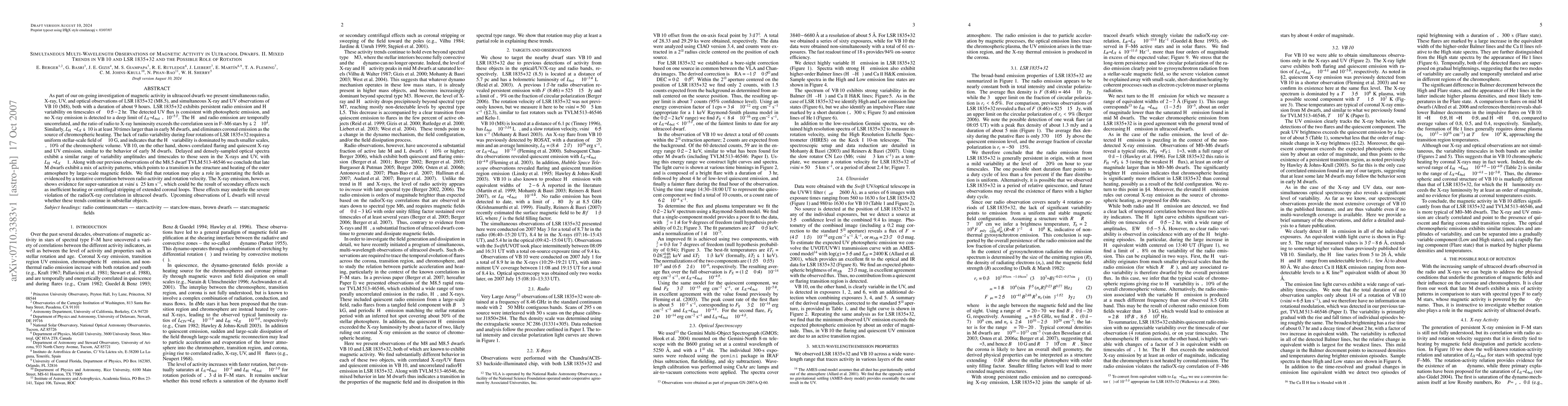This paper investigates magnetic activity in ultracool dwarfs through simultaneous multi-wavelength observations of LSR1835+32 and VB10, revealing mixed trends in their activity patterns. LSR1835+32 shows persistent radio emission and H-alpha variability, while VB10 exhibits correlated X-ray and UV flaring. The study suggests that rotation may influence the generation of magnetic fields, with implications for the structure and heating of the outer atmospheres of late M dwarfs.