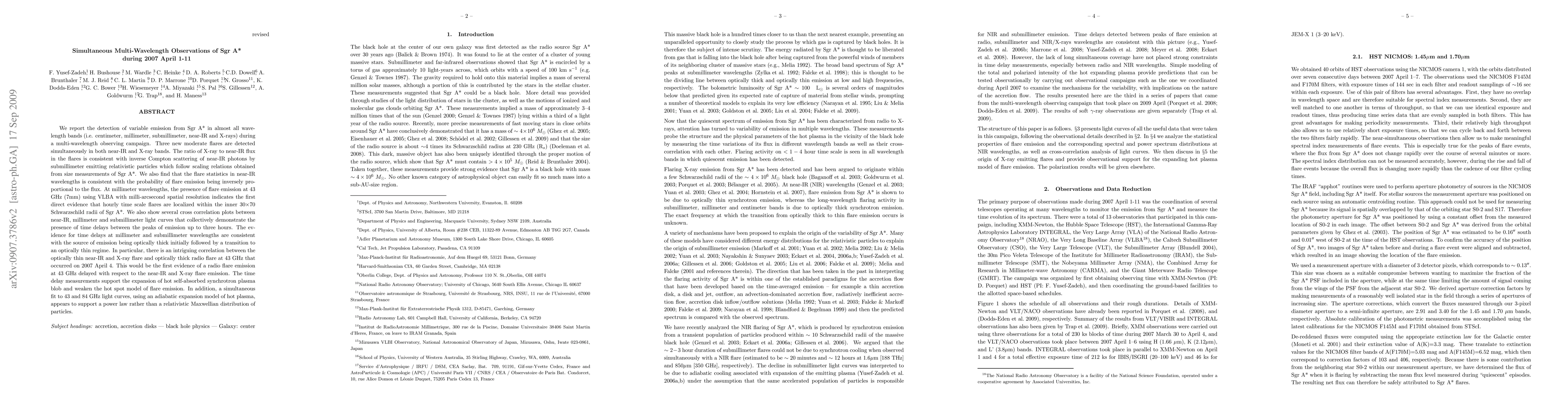 This study reports simultaneous multi-wavelength observations of Sgr A* from April 1-11, 2007, detecting variable emissions across centimeter to X-ray bands, including three new flares. The findings suggest that the X-ray to near-IR flux ratio aligns with inverse Compton scattering, and time delays indicate optically thick to thin transitions in emission sources.