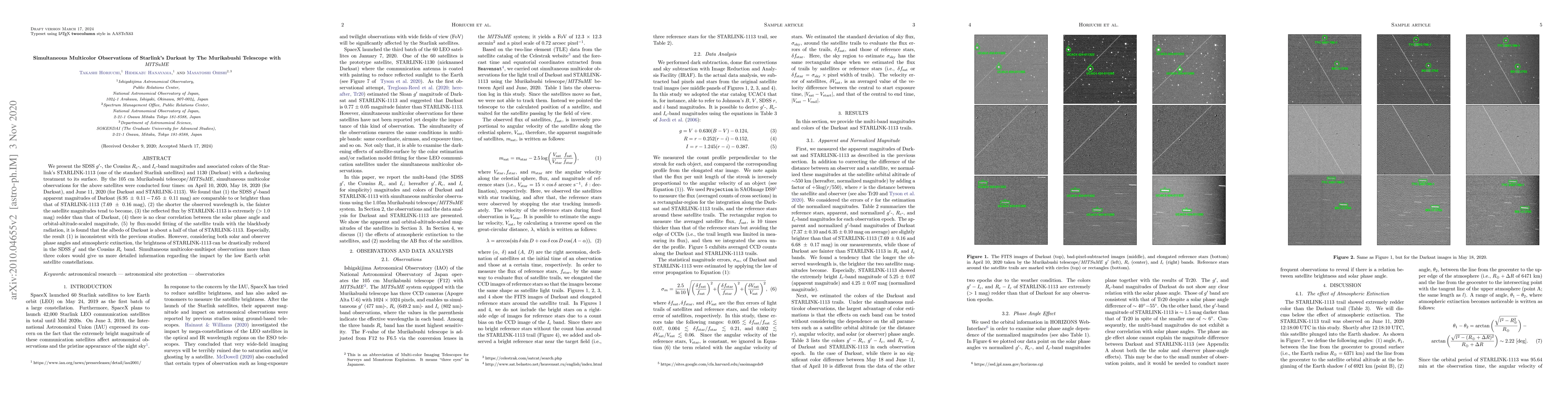 This study reports simultaneous multicolor observations of Starlink satellites STARLINK-1113 and Darksat using the Murikabushi telescope with MITSuME. The findings indicate that Darksat is brighter in the $g'$ band compared to STARLINK-1113, and the reflected flux from STARLINK-1113 is significantly redder, suggesting a lower albedo for Darksat.