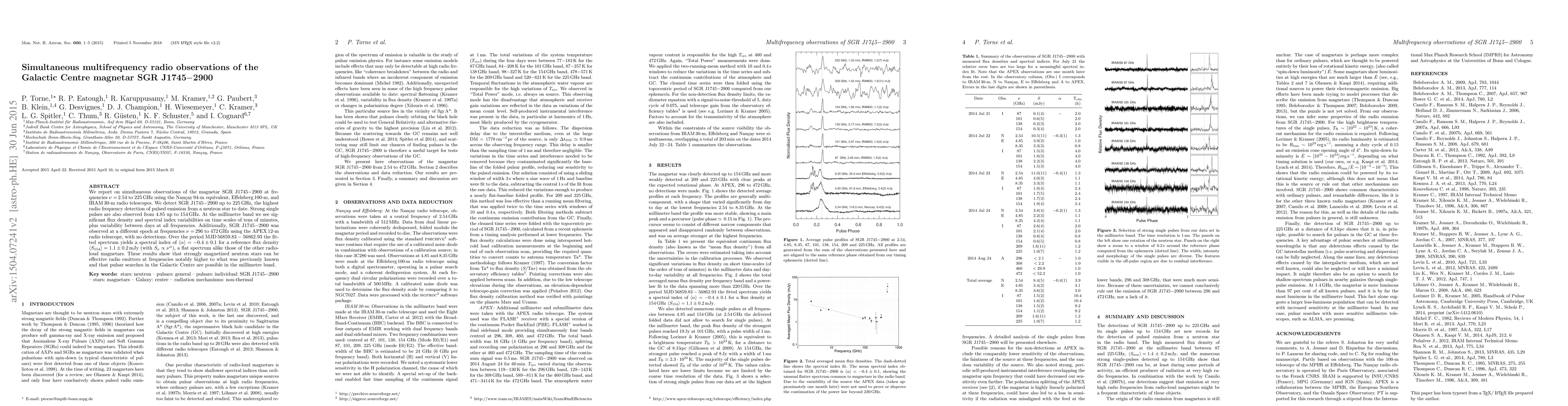 We report on simultaneous observations of the magnetar SGR J1745-2900 at frequencies $\nu = 2.54$ to $225\,\rm{GHz}$ using the Nancay 94-m equivalent, Effelsberg 100-m, and IRAM 30-m radio telescopes. We detect SGR J1745-2900 up to 225 GHz, the highest radio frequency detection of pulsed emission from a neutron star to date. Strong single pulses are also observed from 4.85 up to 154 GHz. At the millimetre band we see significant flux density and spectral index variabilities on time scales of tens of minutes, plus variability between days at all frequencies. Additionally, SGR J1745-2900 was observed at a different epoch at frequencies 296 to 472 GHz using the APEX 12-m radio telescope, with no detections. Over the period MJD 56859.83-56862.93 the fitted spectrum yields a spectral index of $\left<\alpha\right> = -0.4 \pm 0.1$ for a reference flux density $\left< S_{154} \right> = 1.1 \pm 0.2\rm{\,mJy}$ (with $S_{\nu} \propto {\nu}^{\alpha})$, a flat spectrum alike those of the other radio-loud magnetars. These results show that strongly magnetized neutron stars can be effective radio emitters at frequencies notably higher to what was previously known and that pulsar searches in the Galactic Centre are possible in the millimetre band.