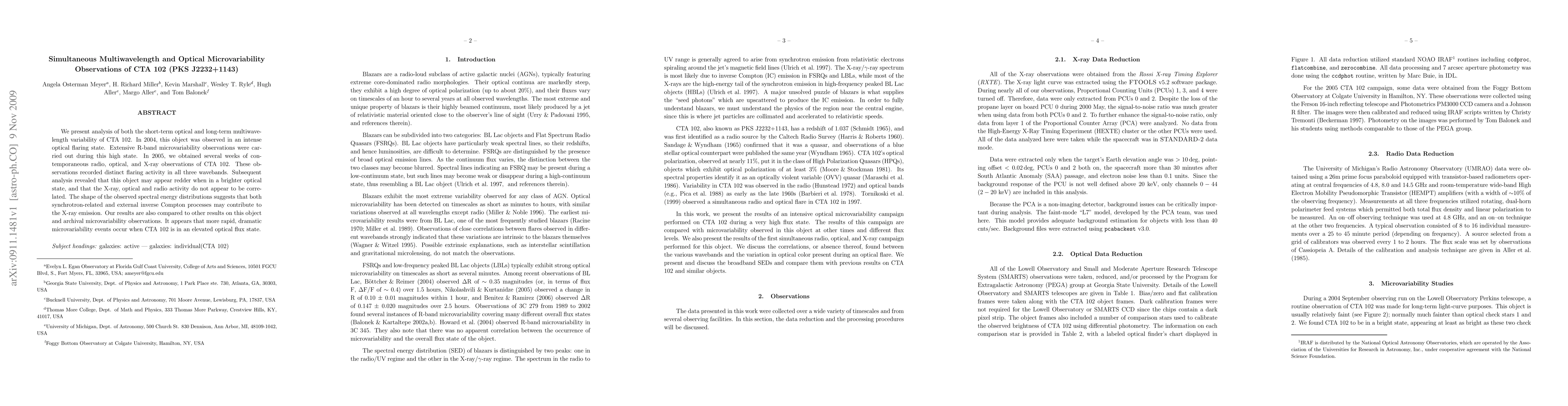 The study of CTA 102 (PKS J2232+1143) reveals that it exhibited intense optical flaring in 2004 with R-band microvariability, and distinct flaring activity across radio, optical, and X-ray in 2005. The research finds that the object appears redder in brighter optical states, with uncorrelated X-ray, optical, and radio activity. Synchrotron-related and external inverse Compton processes likely contribute to X-ray emission, and CTA 102 displays more rapid microvariability during elevated optical flux.