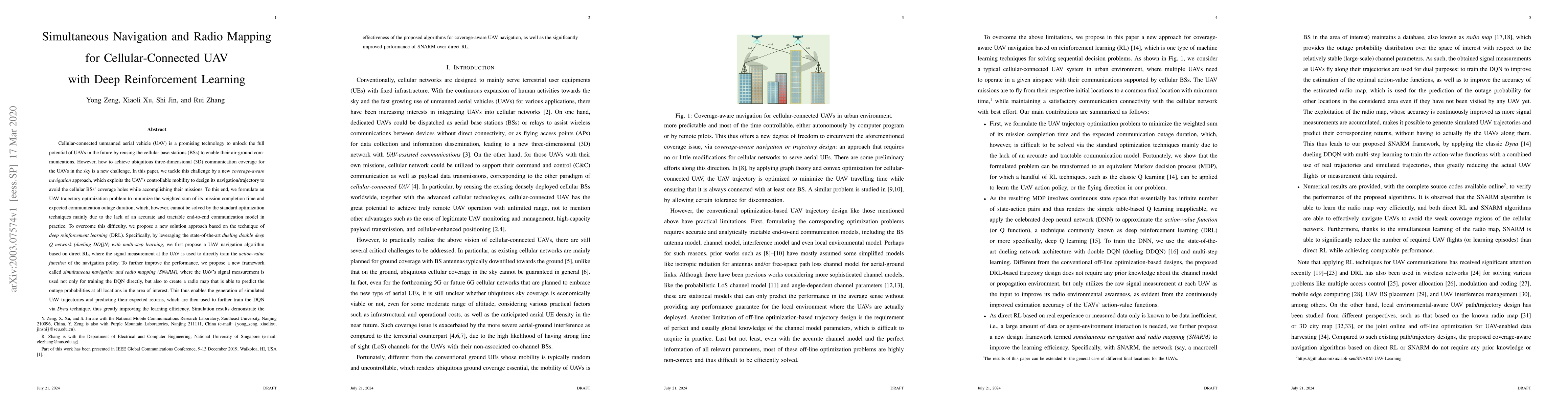 This paper presents a coverage-aware navigation approach for cellular-connected UAVs using deep reinforcement learning to optimize UAV trajectories and minimize mission completion time and communication outage. The proposed SNARM framework uses UAV signal measurements to create a radio map and simulate UAV trajectories to enhance DQN training efficiency.