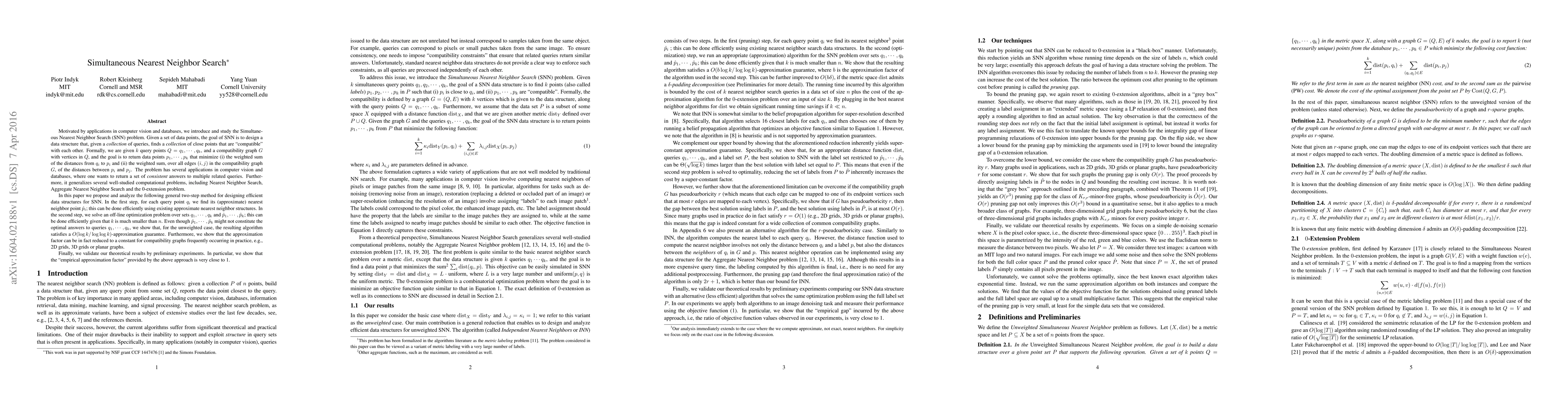 Motivated by applications in computer vision and databases, we introduce and study the Simultaneous Nearest Neighbor Search (SNN) problem. Given a set of data points, the goal of SNN is to design a data structure that, given a collection of queries, finds a collection of close points that are compatible with each other. Formally, we are given $k$ query points $Q=q_1,\cdots,q_k$, and a compatibility graph $G$ with vertices in $Q$, and the goal is to return data points $p_1,\cdots,p_k$ that minimize (i) the weighted sum of the distances from $q_i$ to $p_i$ and (ii) the weighted sum, over all edges $(i,j)$ in the compatibility graph $G$, of the distances between $p_i$ and $p_j$. The problem has several applications, where one wants to return a set of consistent answers to multiple related queries. This generalizes well-studied computational problems, including NN, Aggregate NN and the 0-extension problem. In this paper we propose and analyze the following general two-step method for designing efficient data structures for SNN. In the first step, for each query point $q_i$ we find its (approximate) nearest neighbor point $\hat{p}_i$; this can be done efficiently using existing approximate nearest neighbor structures. In the second step, we solve an off-line optimization problem over sets $q_1,\cdots,q_k$ and $\hat{p}_1,\cdots,\hat{p}_k$; this can be done efficiently given that $k$ is much smaller than $n$. Even though $\hat{p}_1,\cdots,\hat{p}_k$ might not constitute the optimal answers to queries $q_1,\cdots,q_k$, we show that, for the unweighted case, the resulting algorithm is $O(\log k/\log \log k)$-approximation. Also, we show that the approximation factor can be in fact reduced to a constant for compatibility graphs frequently occurring in practice. Finally, we show that the "empirical approximation factor" provided by the above approach is very close to 1.