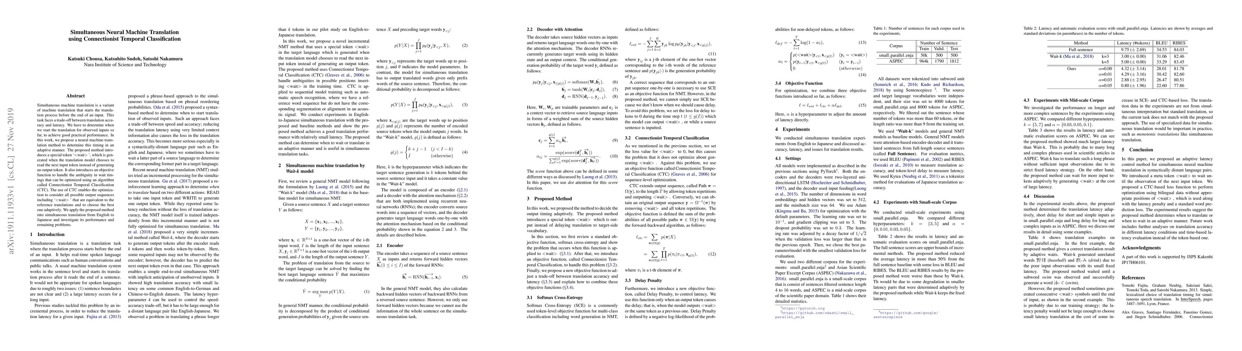 This paper proposes a neural machine translation method for simultaneous translation using Connectionist Temporal Classification (CTC) to adaptively determine translation timing. The method introduces a '<wait>' token and an objective function to optimize wait timings, enabling the model to choose the best translation sequence adaptively.