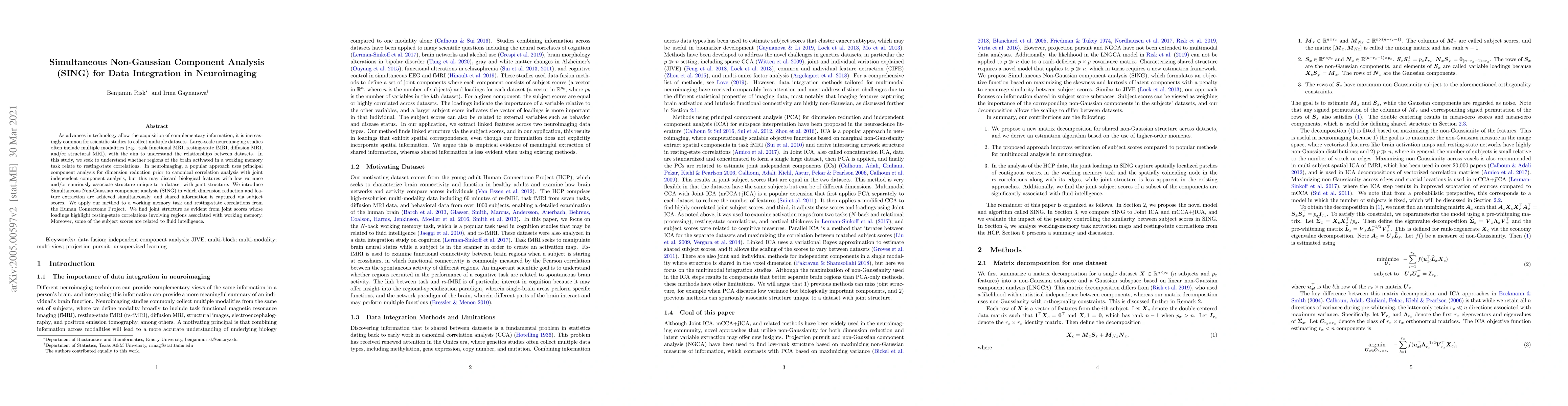 This study introduces Simultaneous Non-Gaussian Component Analysis (SING) for integrating multiple neuroimaging datasets to explore relationships between working memory tasks and resting-state correlations. The method captures shared information without discarding low-variance features, revealing joint structures linking working memory regions with resting-state activity and fluid intelligence.